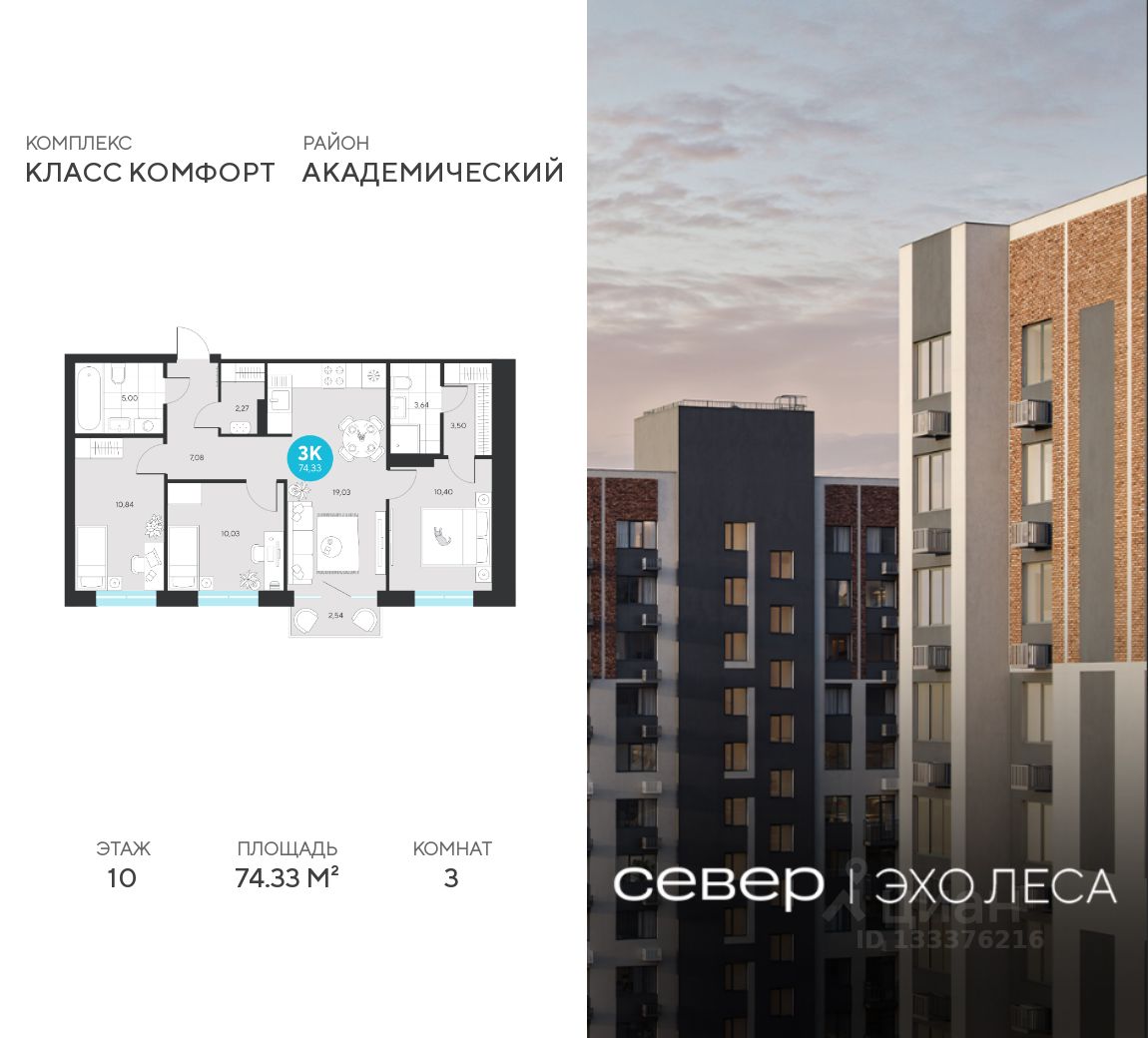 Продаётся квартира площадью 74.33 м2 в жилом комплексе ''Эхо леса''. Квартира находится на 10 этаже, жилая площадь квартиры 31.27 м2, площадь просторной кухни — 19.03 м2. Среди особенностей планировки — изолированные комнаты с окнами на одну сторону, 1 совмещённый санузел.