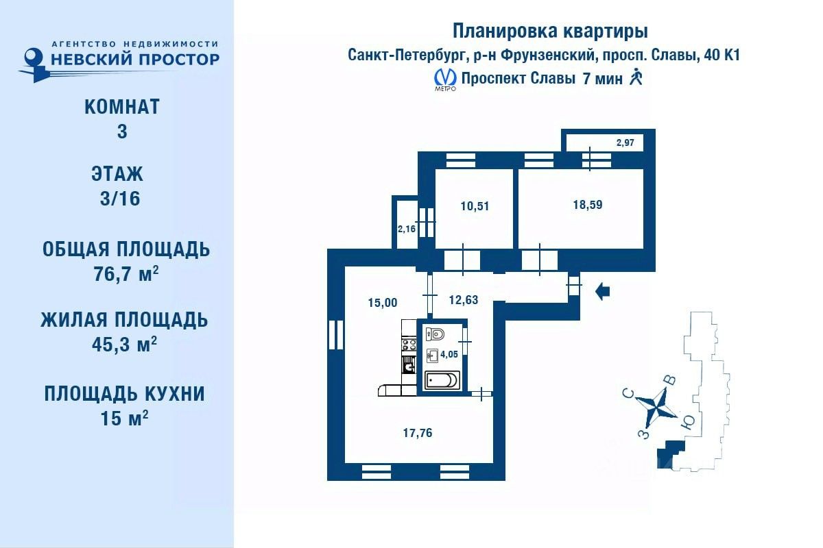 Арт. 125589182 Предлагаем вашему вниманию уютную просторную квартиру, расположенную по адресу: проспект Славы, дом 40, корпус 1.