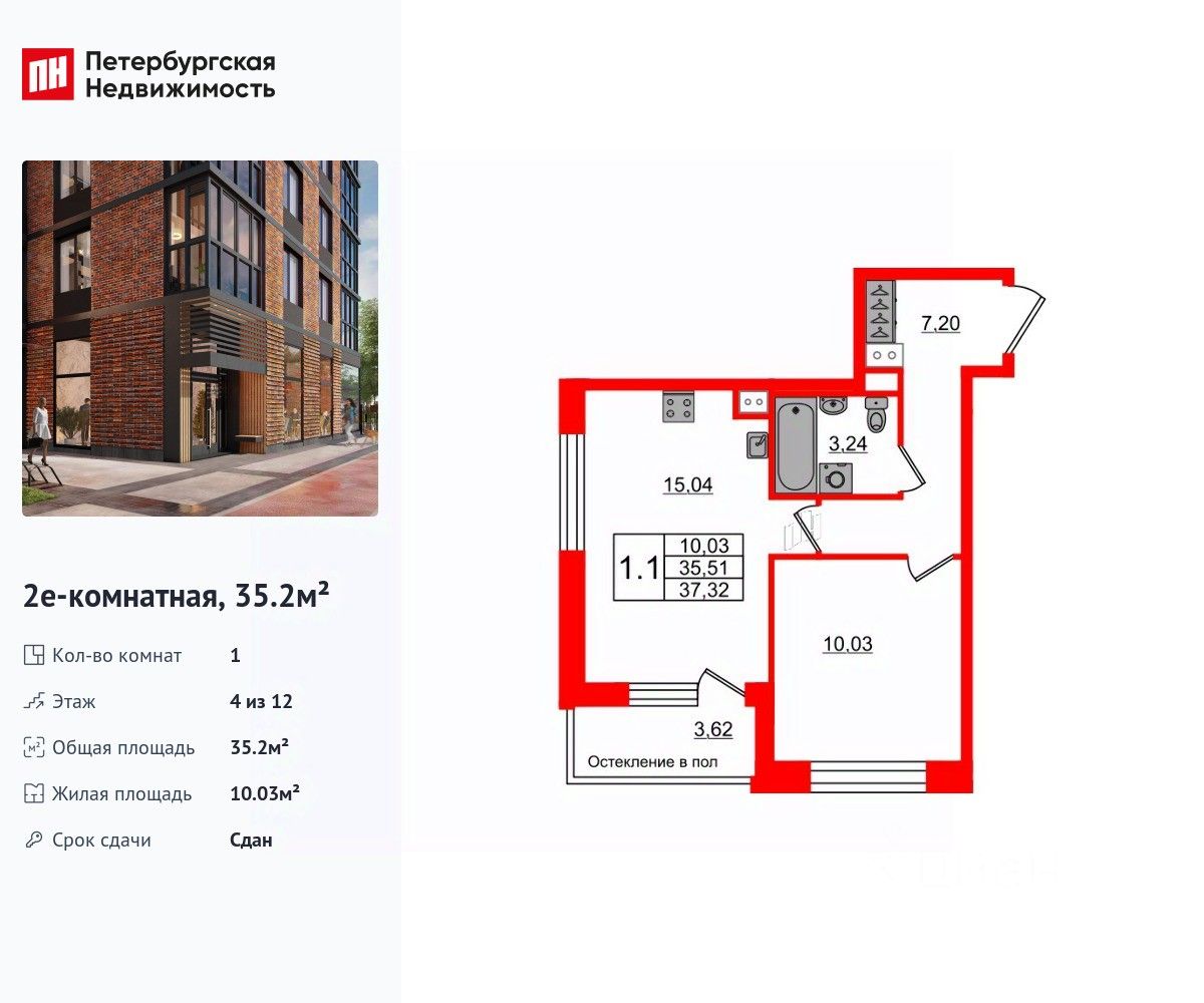 Удобная, классическая, функциональная европланировка, большая кухня-гостиная 15.04 м², просторная прихожая 7.2 м². Общая площадь квартиры - 35.2 м², жилая 10.03 м², высота потолка 2.77 м.