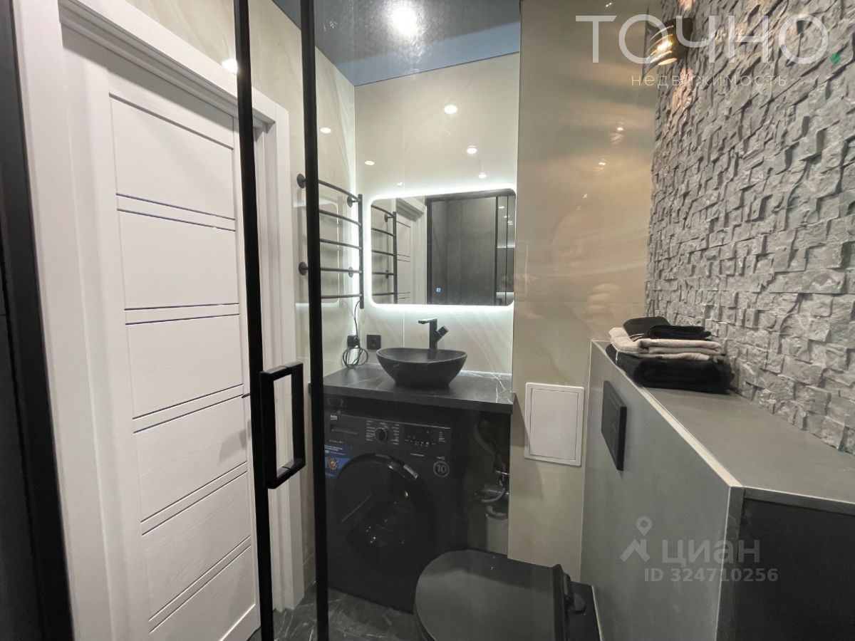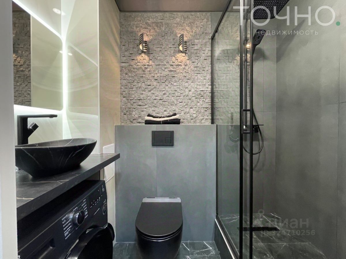 В санузле: стены -плиты керамогранит, потолок натяжной теневой в уборной, декоративный камень с подсветкой, полотенцесушитель, зеркало с подсветкой, вся сантехника чёрного цвета.
