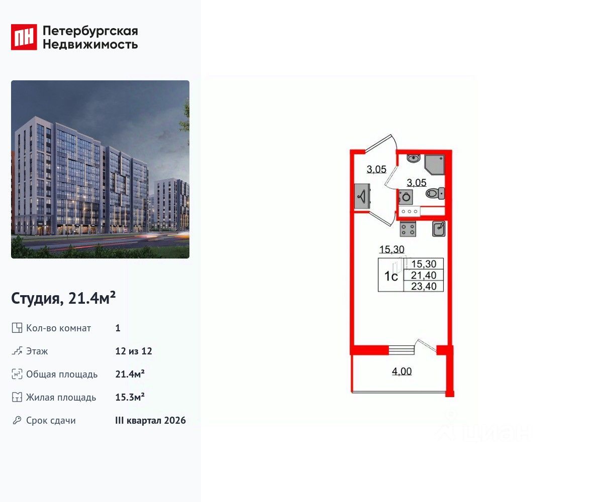 Удобная, классическая, функциональная европланировка, вместительная прихожая 3.05 м². Общая площадь студии - 21.4 м², жилая 15.3 м², высота потолка 3 м.