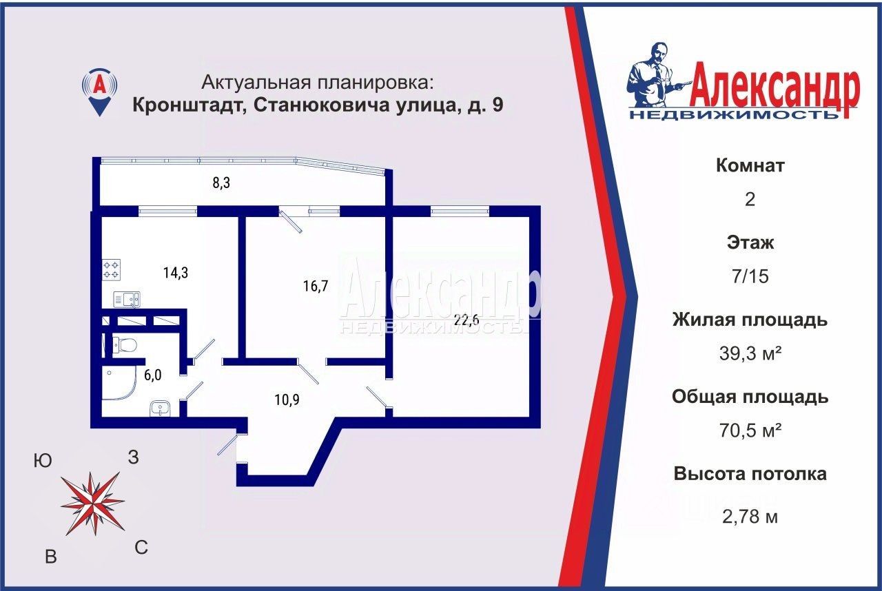 1705296 Предлагаем купить просторную видовую 2-х комнатную квартиру 70,5 м² в Кронштадте с большой утепленной лоджией 8,3 м² (не входит в общую площадь квартиры) с панорамным остеклением, с которой можно наблюдать прекрасные вечерние закаты. Квартира расположена на 7 этаже 15-ти этажного монолитно-кирпичного дома 2007 года постройки. Квартира светлая, теплая, тихая, с большими окнами. Из окон квартиры открывается прекрасный вид на ''Финский залив''. Высота потолков 2,78 м создает дополнительный объем пространства Две изолированные комнаты правильной формы 22,6 м² и 16,7 м² позволяют реализовать любое размещение мебели. Просторная кухня 14,3 м². Кухонный гарнитур с техникой остается новому владельцу. В прихожей и большой комнате смонтированы заказные шкафыкупе, которые также остаются. Вместительный совмещенный санузел (6 м²) с душевой кабиной и стиральной машиной. В квартире выполнен ремонт с использованием качественных обоев и сантехники. Установлены итальянские двери. На полу в комнатах уложен ламинат. В коридоре, кухне и санузле керамическая плитка. В квартире после ремонта никто не проживал. В доме своя управляющая компания. Круглосуточная служба диспетчера, видеонаблюдение, консьерж. Однородная социальная среда. Удачное расположение дома позволяет за пару минут выехать на КАД. До метро ''Беговая'' - 30 минут на автомобиле. В шаговой доступности остановки общественного транспорта, ''Сбербанк'', поликлиника, супермаркет с огромной бесплатной парковкой, спортивный комплекс ''Газпром'' с бассейном. Во дворе детская и спортивная площадки, тренажеры. В 5 минутах новый променад вдоль залива. В 3 минутах известные гимназия 418 и детский сад 18.