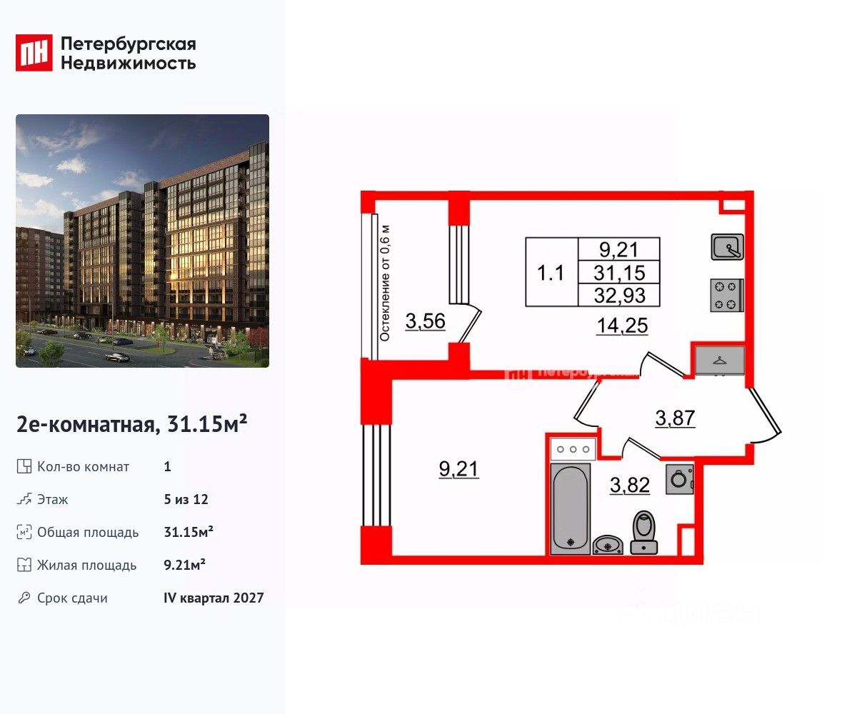 Удобная, классическая, функциональная европланировка, большая кухня-гостиная 14.25 м², вместительная прихожая 3.87 м². Общая площадь квартиры - 31.15 м², жилая 9.21 м², высота потолка 2.75 м.