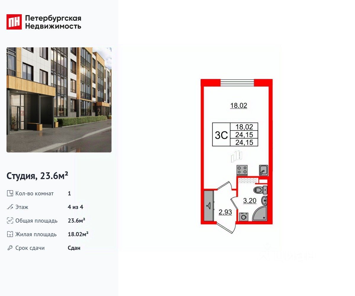 Удобная, классическая, функциональная европланировка, вместительная прихожая 2.93 м². Общая площадь студии - 23.6 м², жилая 18.02 м², высота потолка 3.07 м.