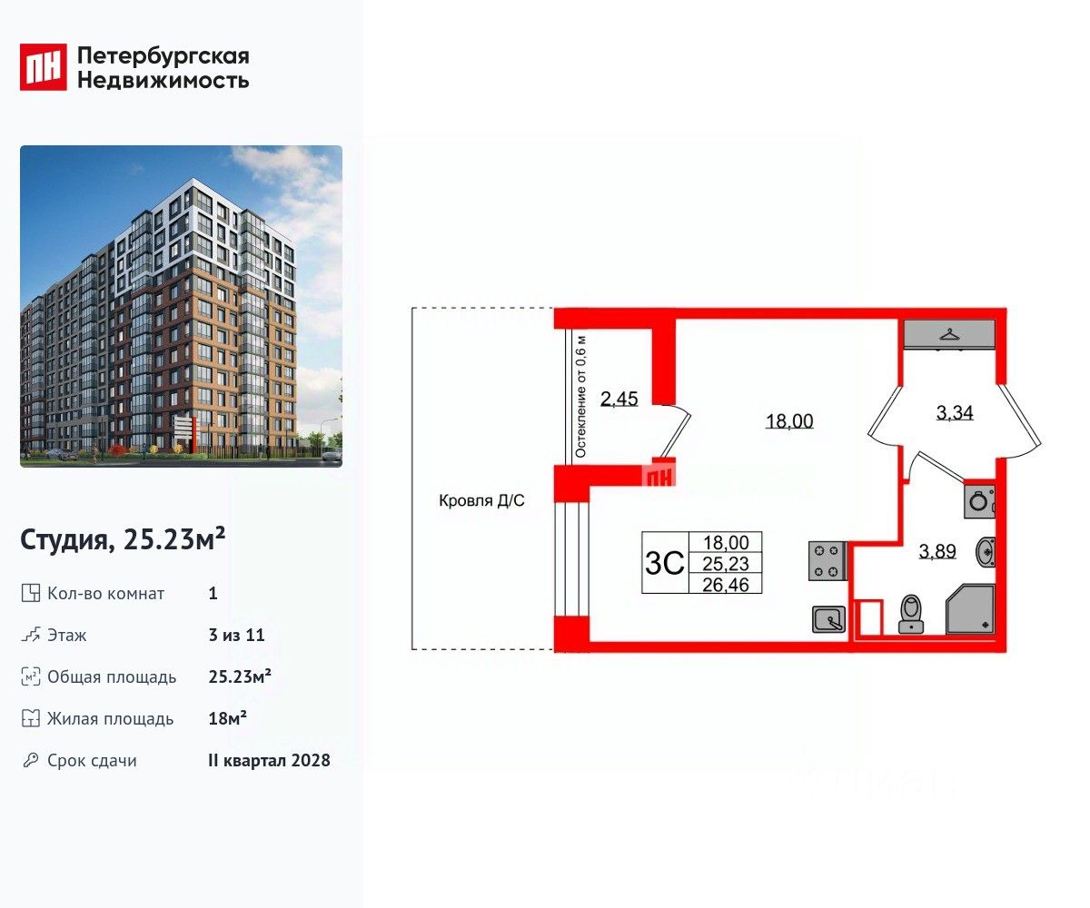 Удобная, классическая, функциональная европланировка, просторная прихожая 3.34 м². Общая площадь студии - 25.23 м², жилая 18 м², высота потолка 2.77 м.