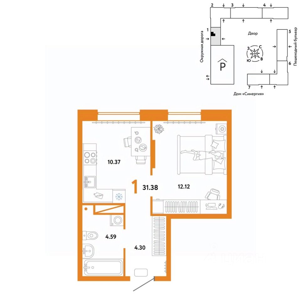 Продается 1комнатная квартира на 12 этаже от застройщика Страна Девелопмент. Площадь квартиры 31,38 кв. м.