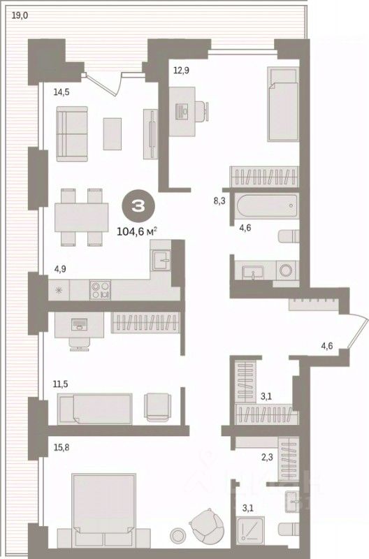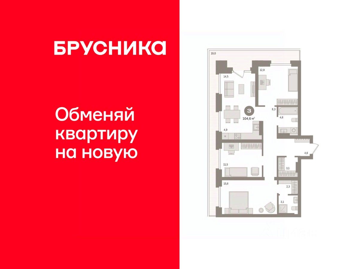 Квартира с кухней-гостиной и тремя спальнями в жилом районе ''Речной порт''. Особенности планировки: балкон, предчистовая отделка. квартиры в нашей базе: РП-07-3-3.8.1.