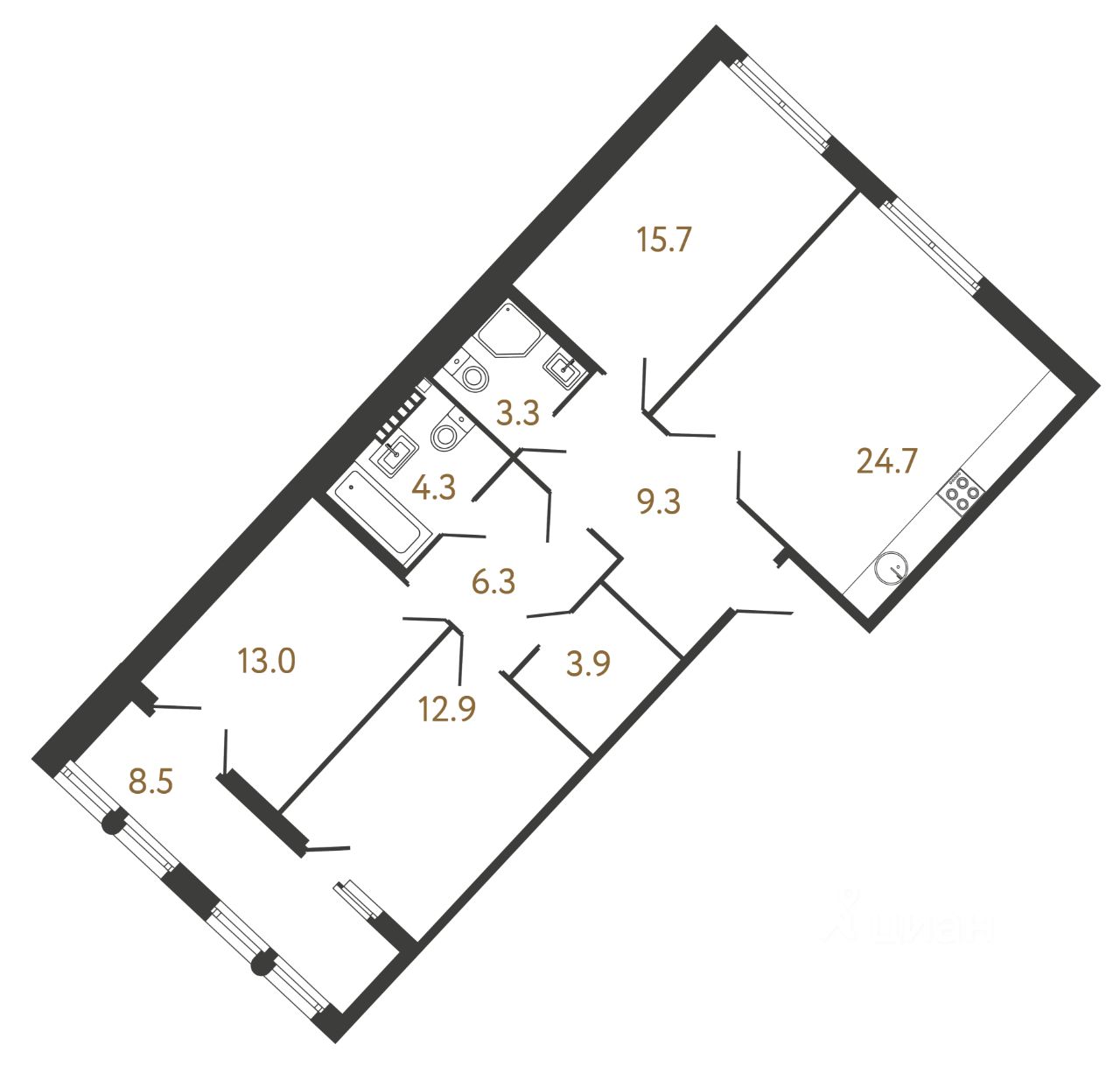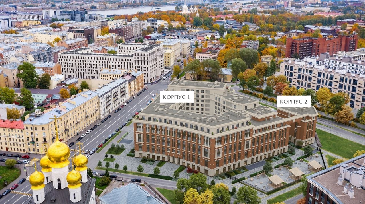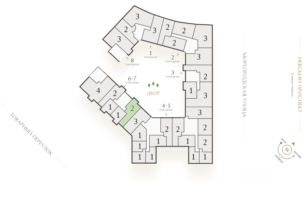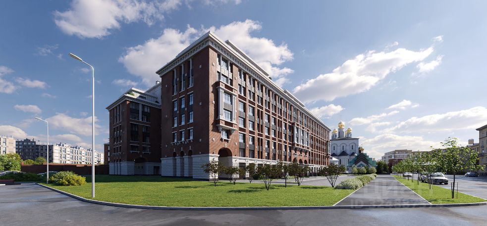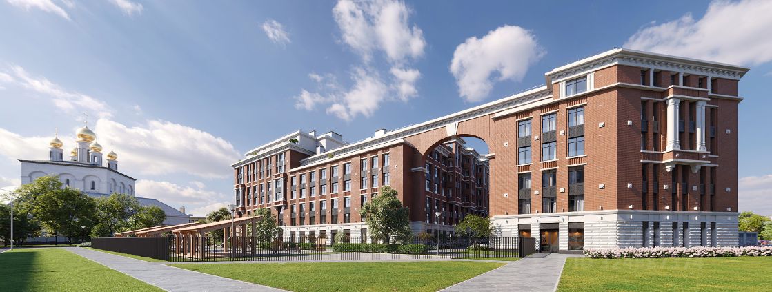 Дом состоит из двух корпусов: разновысотного (6-7-8-9 этажей) на 243 квартиры и небольшого 6-этажного на 20 квартир. Они объединены между собой парадной аркой и формируют контур приватного двора.