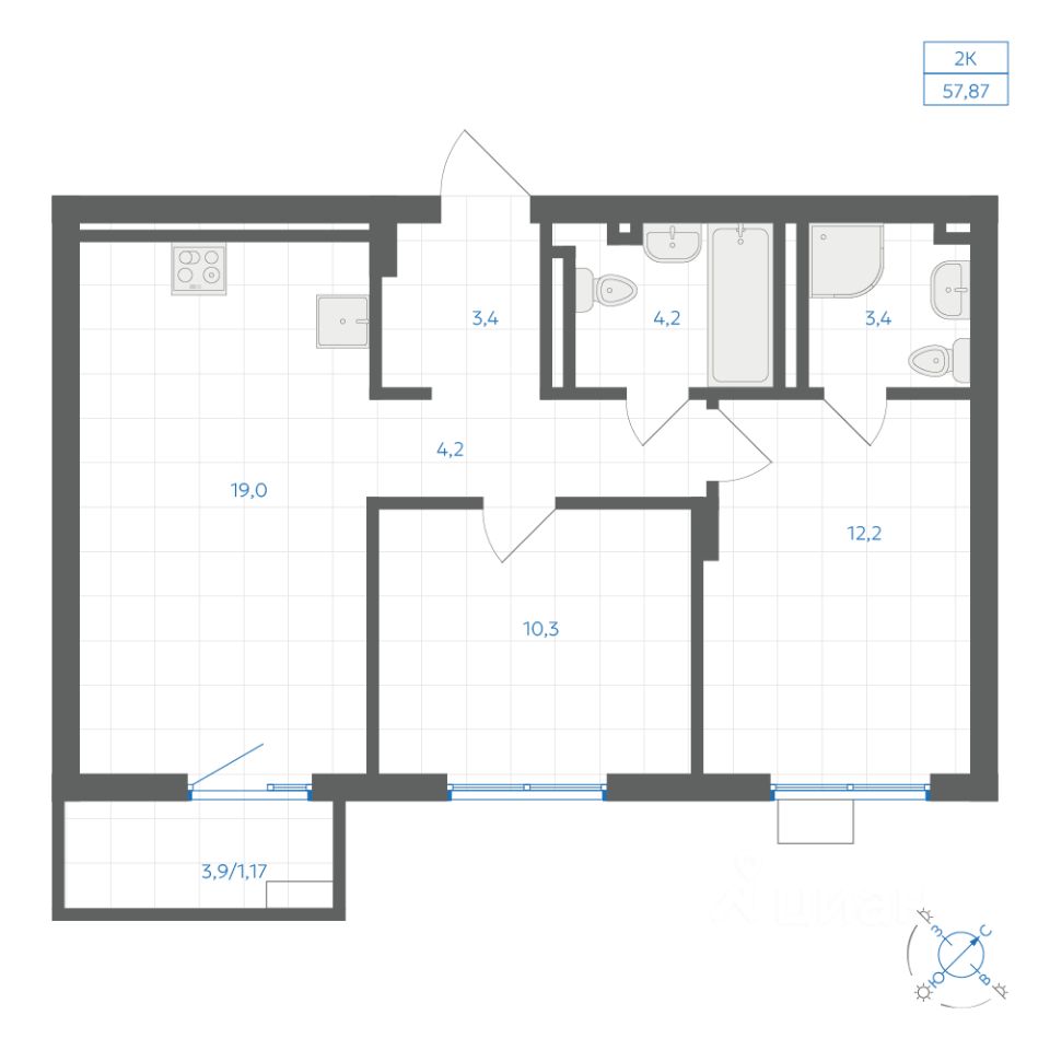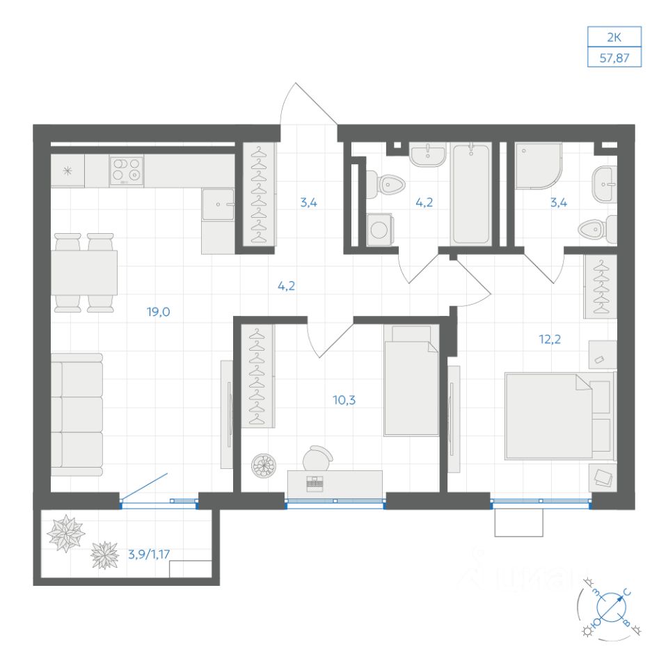Общая площадь57,87 м2