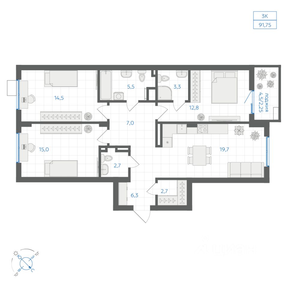 Общая площадь91,75 м2