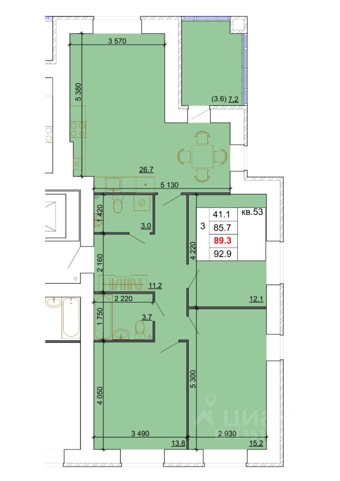 Продаётся 3-комнатная квартира в строящемся доме (з/у 90 (9-я очередь)), срок сдачи: I-кв. 2027, общей площадью 89.3 кв.м., на 2 этаже.