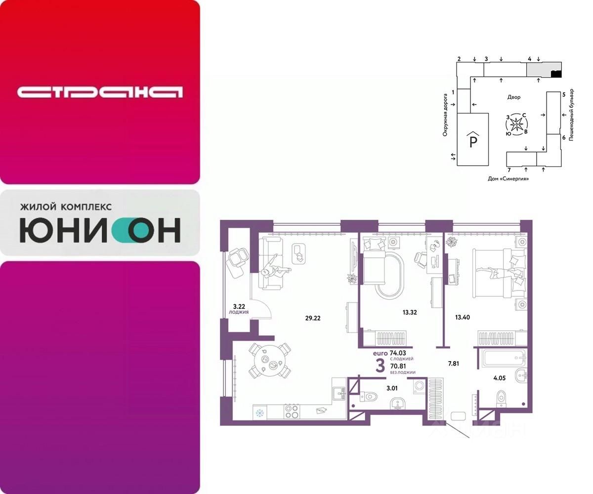 Продается 3комнатная квартира на 8 этаже от застройщика Страна Девелопмент. Площадь квартиры 74,03 кв. м.