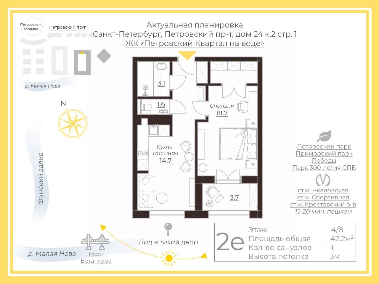Безопасность: Территория полностью огорожена и находится под круглосуточной охраной. Работает консьерж-сервис, установлены системы видеонаблюдения. Благоустройство: Ухоженный двор без машин с ландшафтным дизайном. Имеются детские площадки и зоны для отдыха. Инфраструктура: В шаговой доступности магазины, спортивные залы, детский сад, школа, кафе, рестораны, аптеки и салоны красоты. Транспортная доступность: Пешком до станций метро ''Крестовский остров'' и ''Спортивная'' — около 20 минут. На автомобиле выезд на ЗСД за 2 минуты, до Крестовского острова — 3 минуты, до центра города — примерно 15 минут.