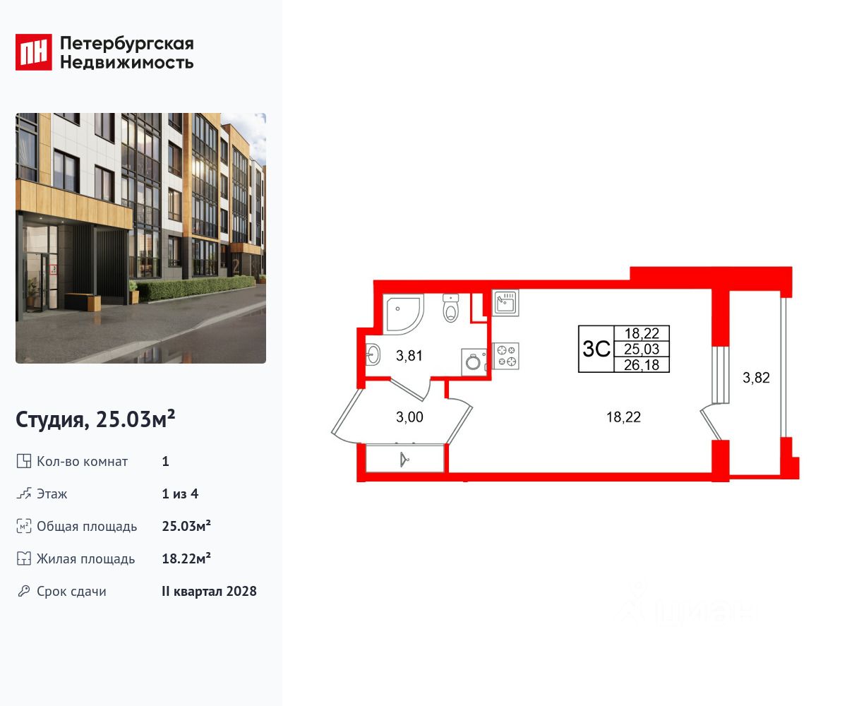 Удобная, классическая, функциональная европланировка, вместительная прихожая 3 м². Общая площадь студии - 25.03 м², жилая 18.22 м², высота потолка 2.77 м.