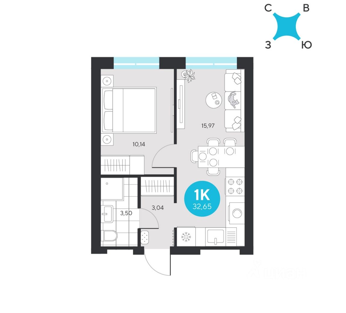 Продаётся квартира площадью 32.65 м2 в жилом комплексе ''Эхо леса''. Квартира находится на 3 этаже, жилая площадь квартиры 10.14 м2, площадь просторной кухни — 15.97 м2. Среди особенностей планировки — изолированные комнаты с окнами на одну сторону, 1 совмещённый санузел.