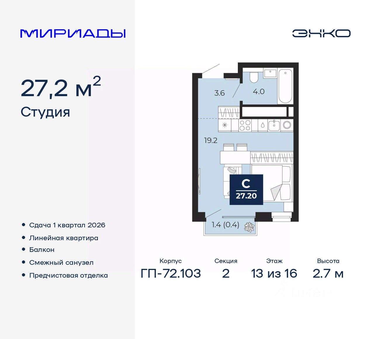 Однокомнатная квартира-студия от застройщика с предчистовой отделкой в ЖК ''Мириады'' на 13 этаже. Общая площадь: 27.2 кв.м., площадь гостиной 19.2 кв.м., из которых 5 кв.м. выделено под кухонную зону. Все окна выходят на одну сторону. В квартире один балкон, один совмещенный санузел. Высота потолков 2.7 м.