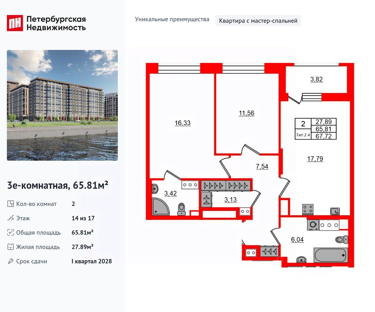 Уникальная, функциональная европланировка, большая кухня-гостиная 17.79 м², вместительная прихожая 7.54 м². Общая площадь квартиры - 65.81 м², жилая 27.89 м², высота потолка 2.77 м.