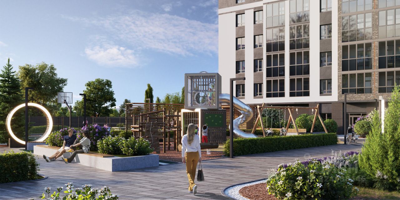 Благоустройство придомовой территории. LOQO экологичный центр для жизни и отдыха. На придомовой территории дома реализована концепция двор-сада без машин и посторонних.