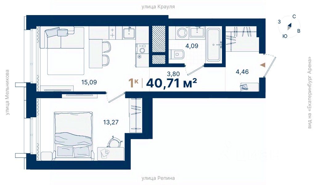 Дома расположены на стрелке улиц Репина и Крауля, рядом со стадионом ''Екатеринбург Арена''. Здесь уже есть все необходимое для жизни: сады, школы, поликлиники и магазины.
