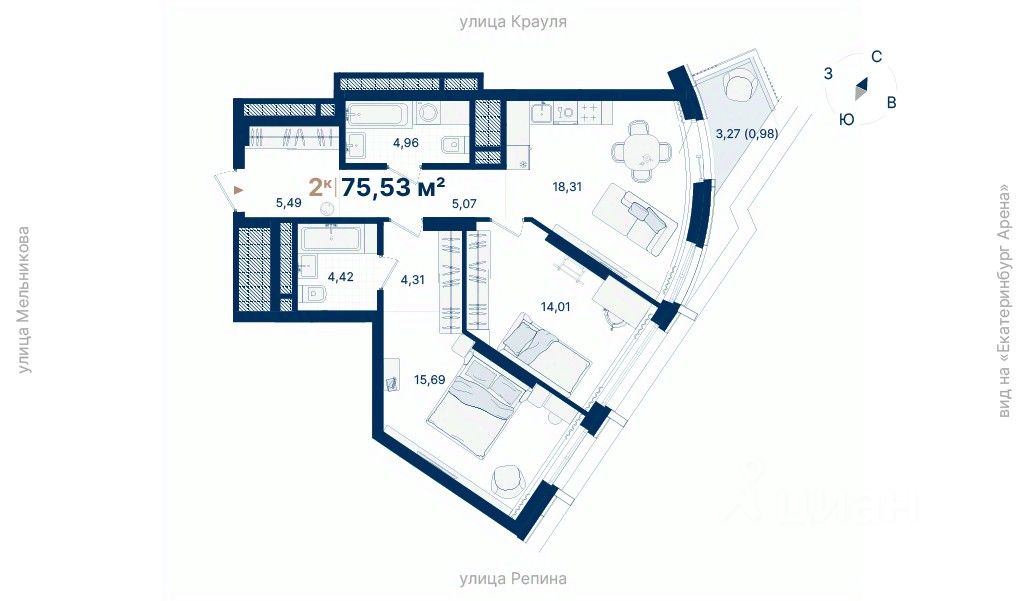 Дома расположены на стрелке улиц Репина и Крауля, рядом со стадионом ''Екатеринбург Арена''. Здесь уже есть все необходимое для жизни: сады, школы, поликлиники и магазины.