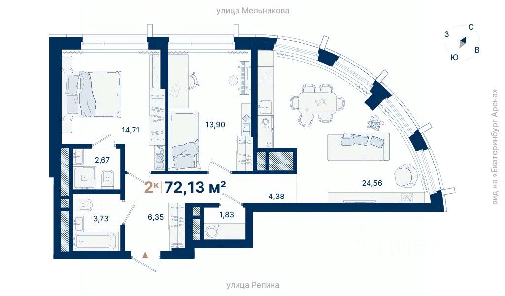 Дома расположены на стрелке улиц Репина и Крауля, рядом со стадионом ''Екатеринбург Арена''. Здесь уже есть все необходимое для жизни: сады, школы, поликлиники и магазины.
