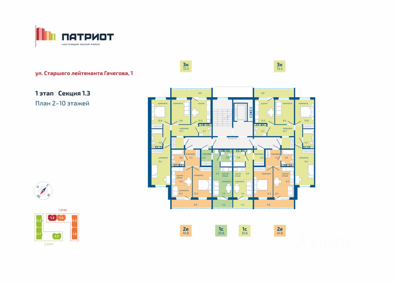 О первом этапе: Адрес: ул. Гачегова, 1. Этажность: 8-10 этажей. Срок сдачи: II кв. 2026 г. - III кв. 2026 г.