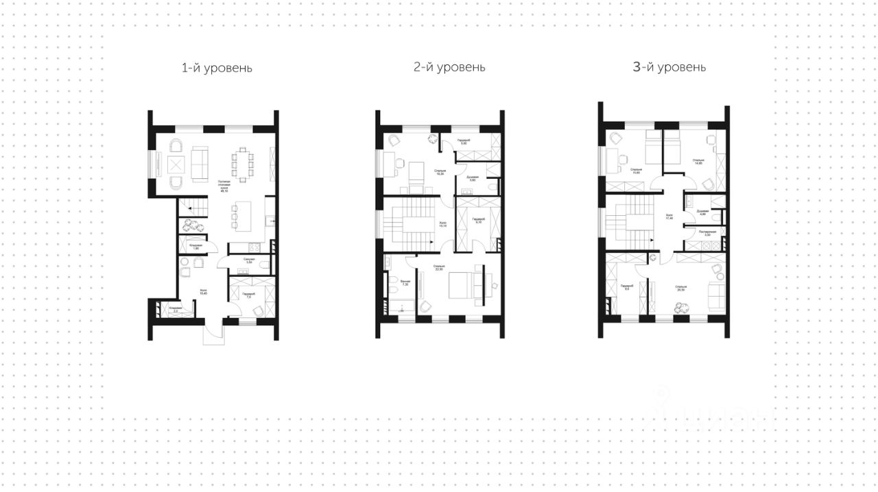 На первом уровне спланирована просторная кухня-гостиная-столовая, гардеробная, две кладовые, гостевой санузел, холл. Планировка второго уровня включает две мастер-спальни со своими ванными комнатами и гардеробными, холл. На третьем уровне расположены мастер-спальня с гардеробной, две спальни, санузел с душевой, постирочная, холл.
