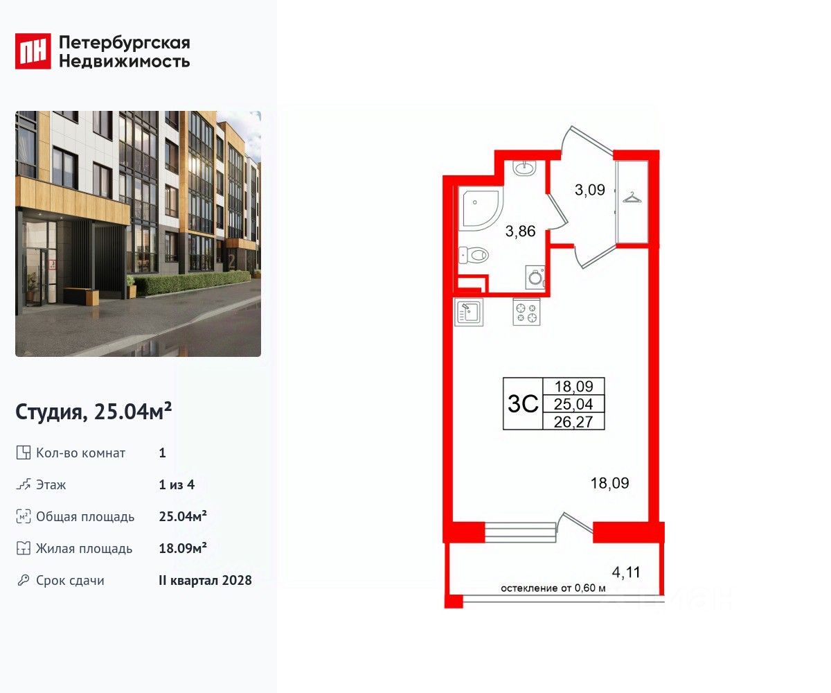 Удобная, классическая, функциональная европланировка, вместительная прихожая 3.09 м². Общая площадь студии - 25.04 м², жилая 18.09 м², высота потолка 2.77 м.
