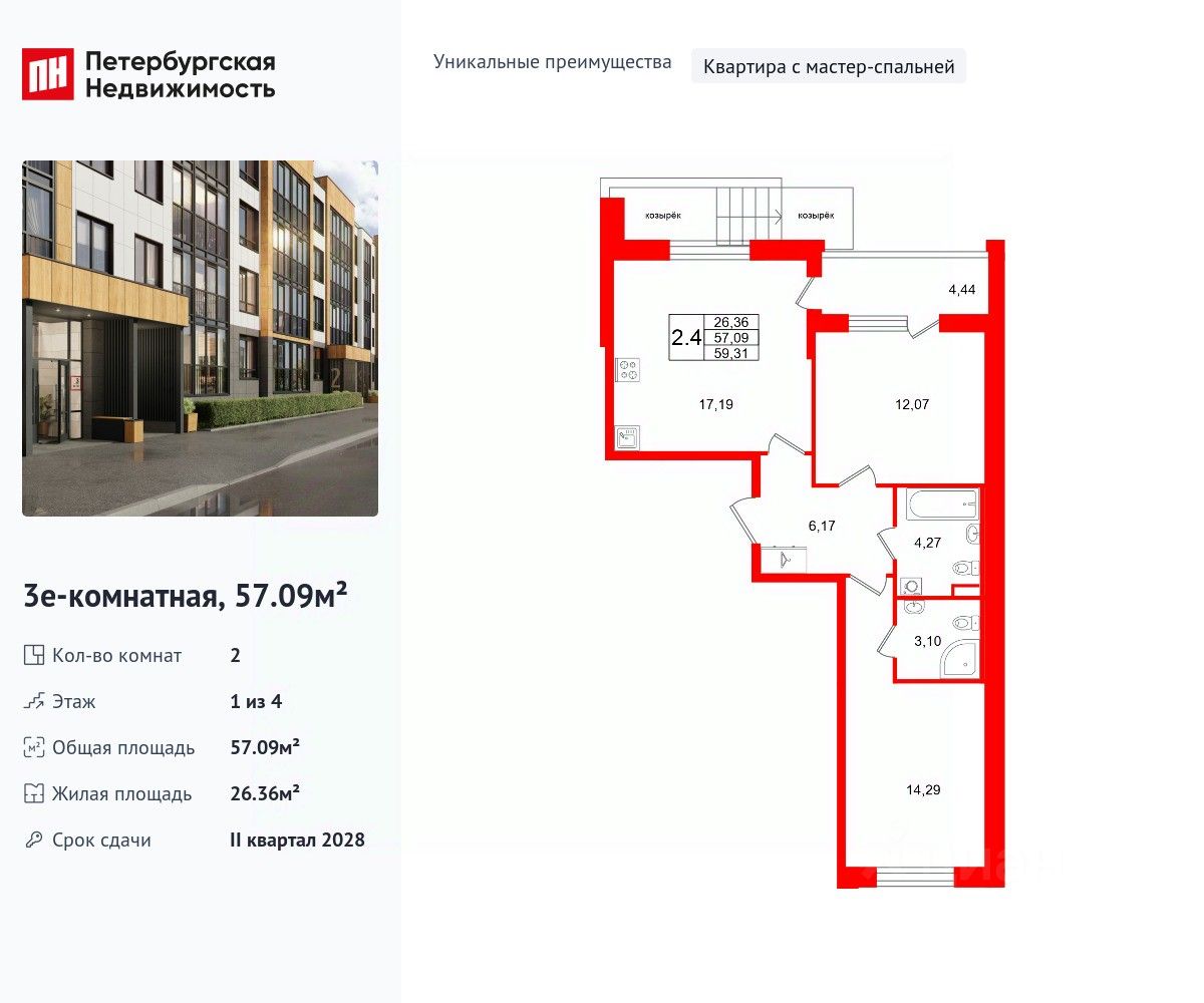 Уникальная, функциональная европланировка, большая кухня-гостиная 17.19 м², вместительная прихожая 6.17 м². Общая площадь квартиры - 57.09 м², жилая 26.36 м², высота потолка 2.77 м.