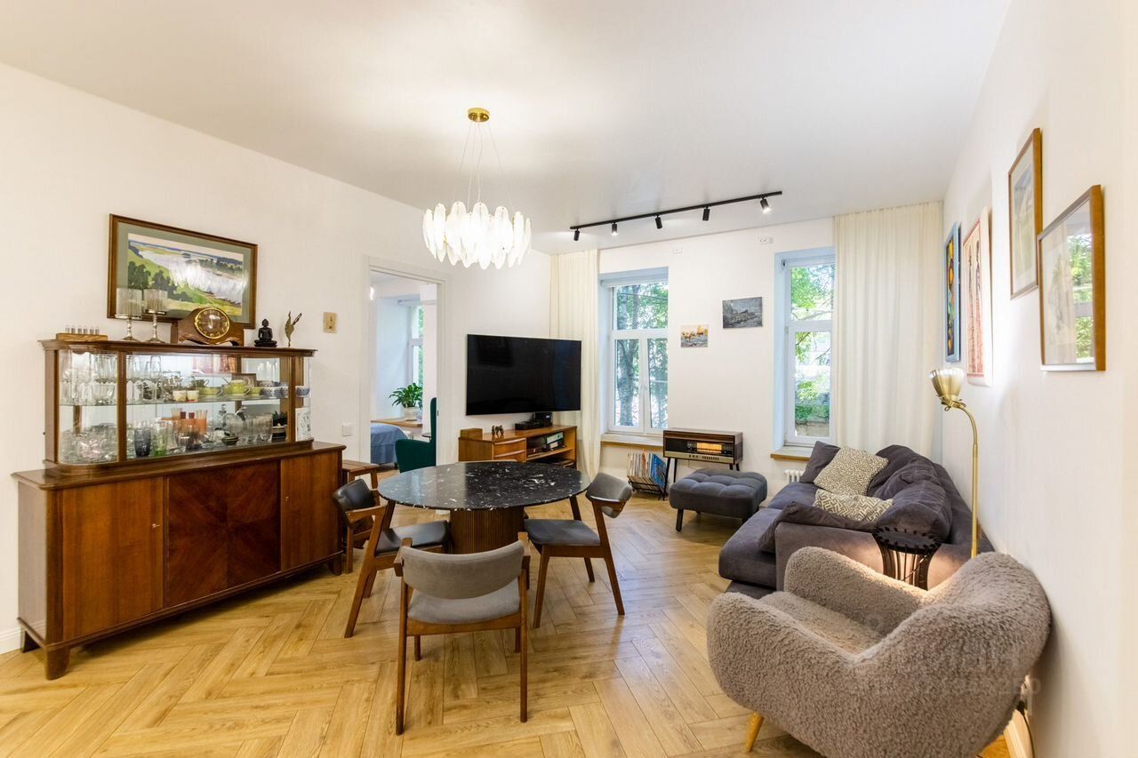 Выполнен дизайнерских ремонт, где гармонично переплетаются 2 стиля: модерн середины века и современный. Сочетание современной техники, натуральных материалов и мебели mid-сеntury. Пространство и плнировка продумана до мелочей для комфортного проживания семьи из нескольких человек.
