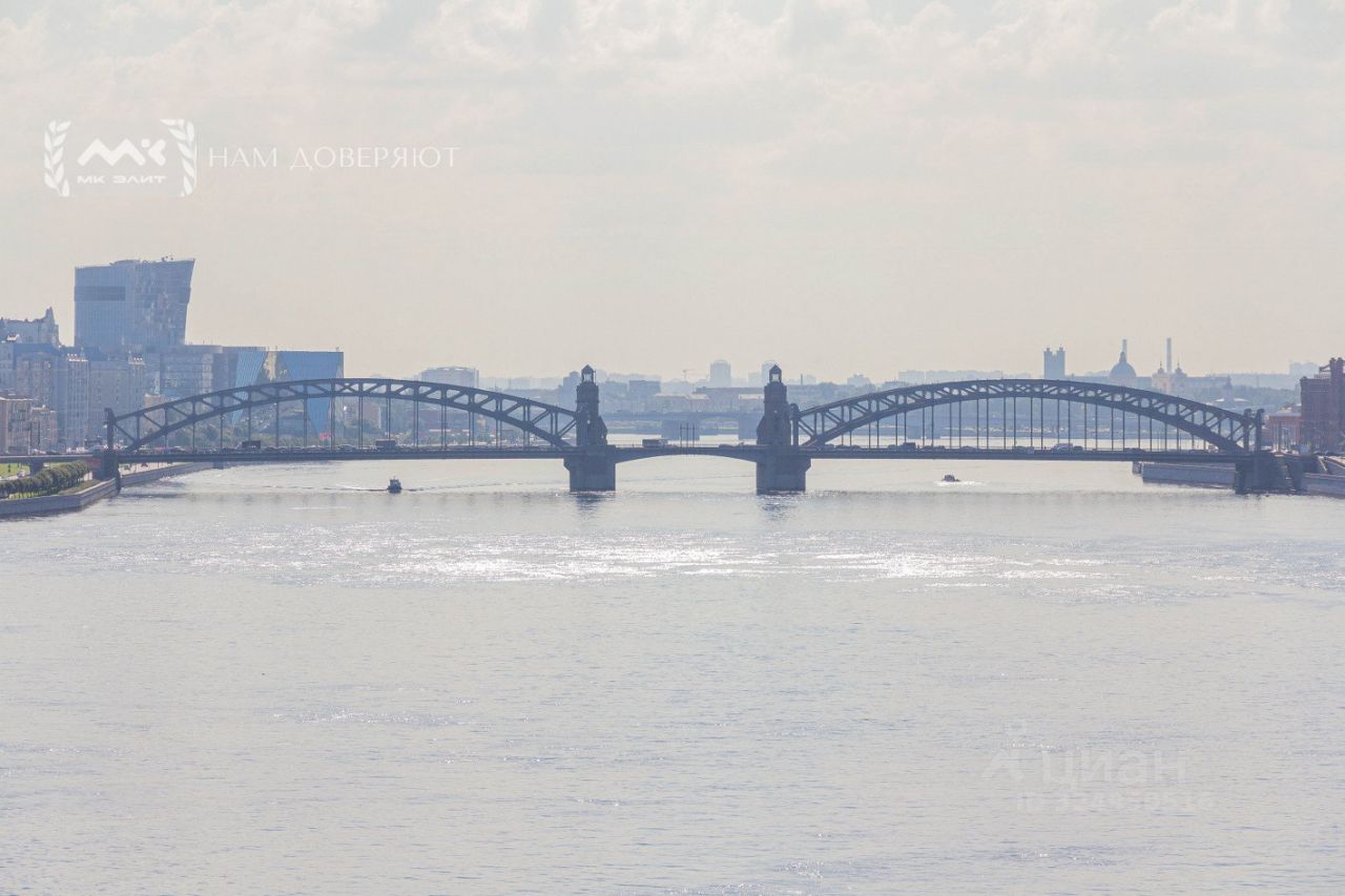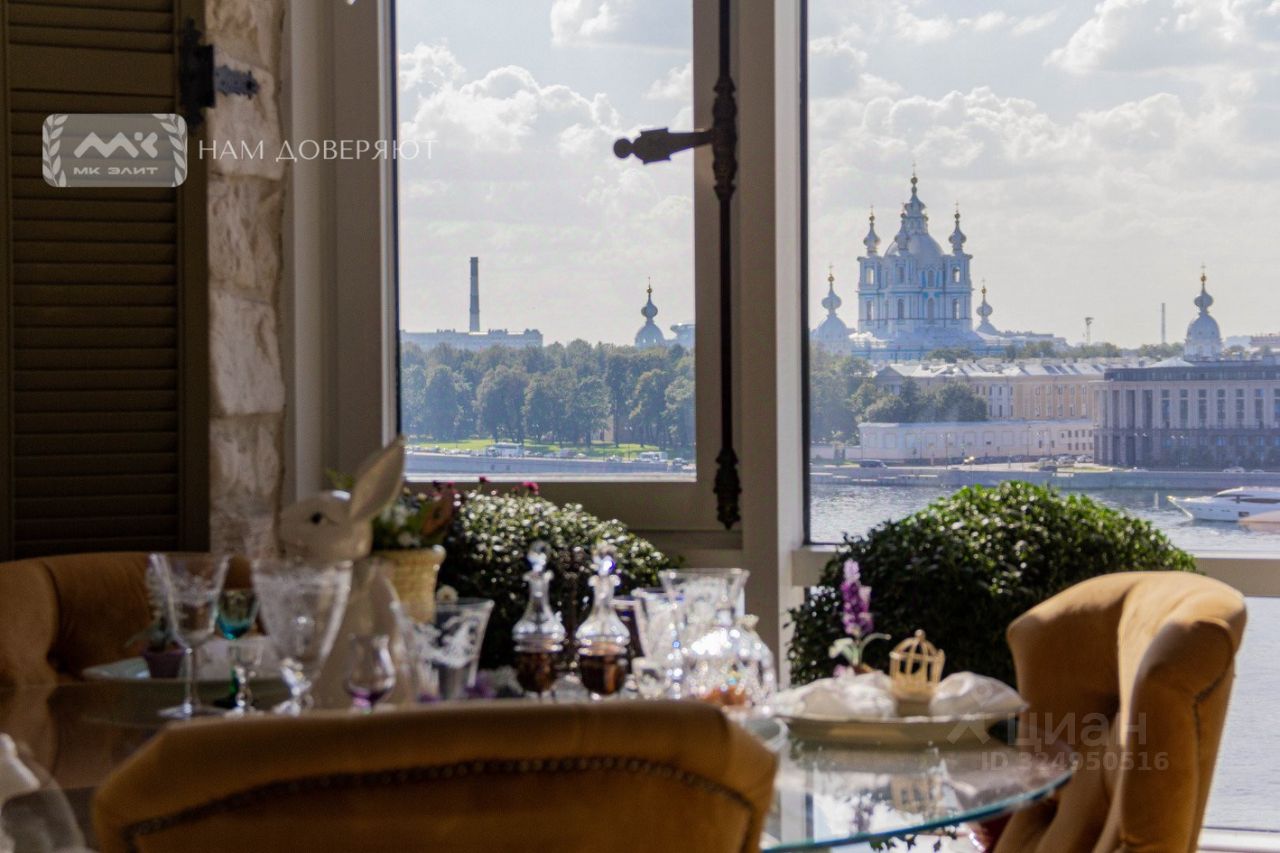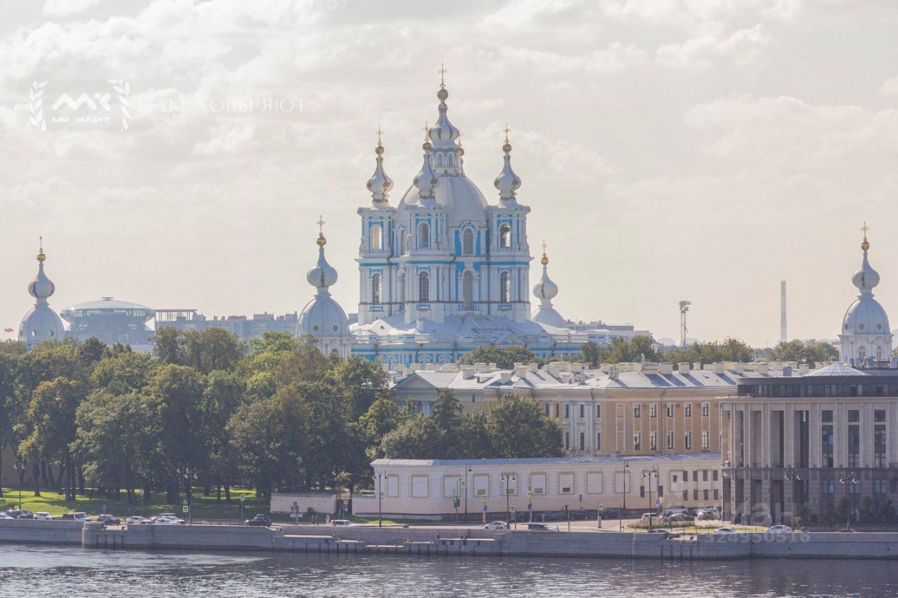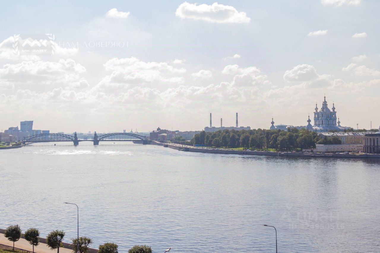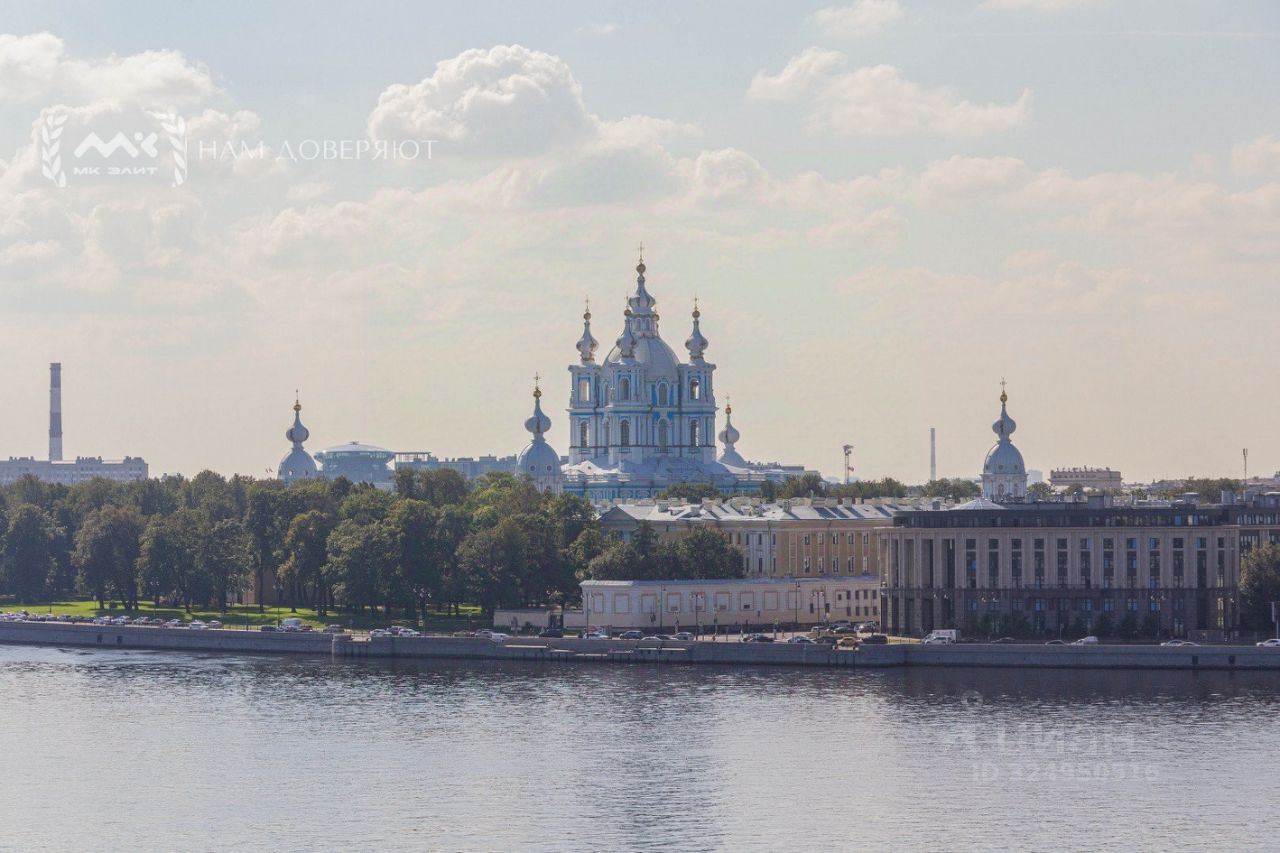 Две спальни, огромная кухня-гостиная, залитая светом, масштабные окна с видом на мерцающую воду, Смольный собор и историческую панораму города, гардеробная, просторная ванная комната.