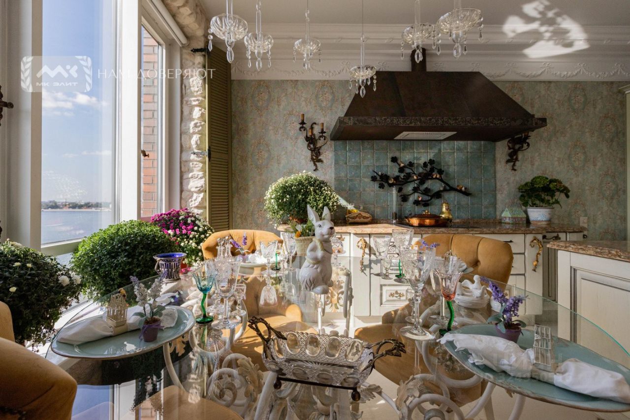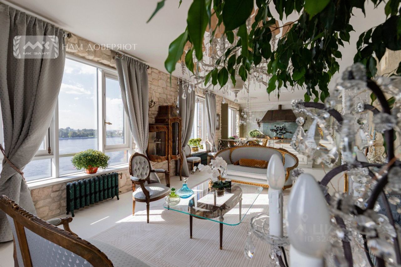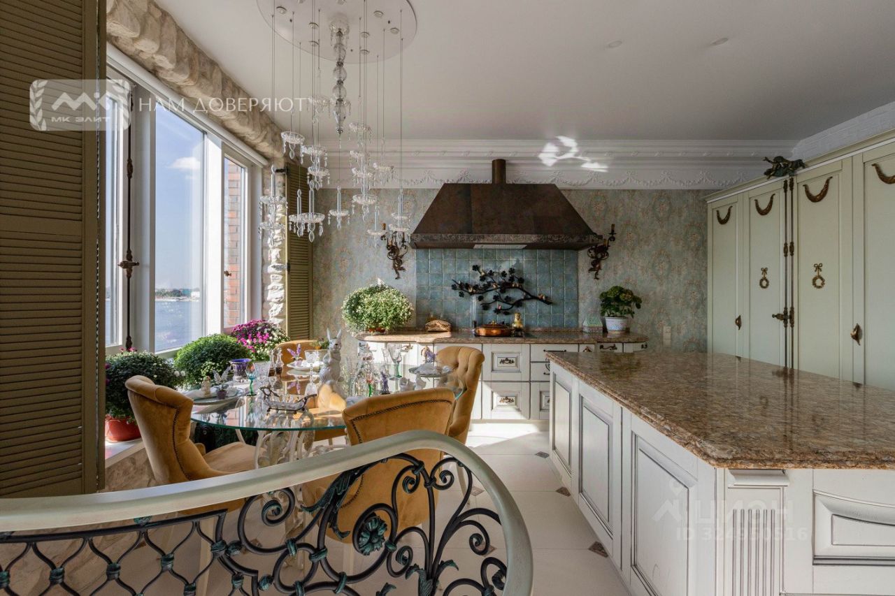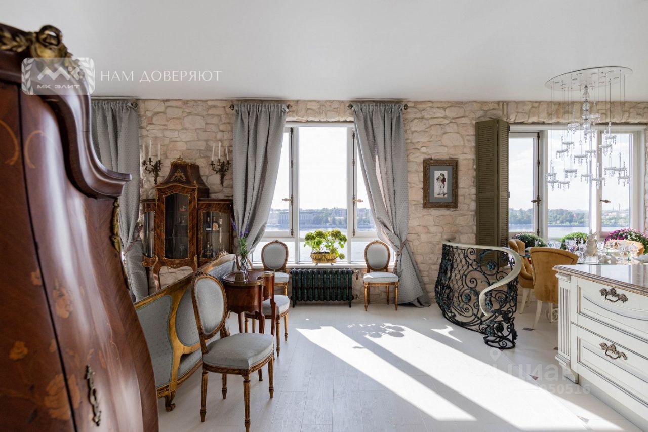 Две спальни, огромная кухня-гостиная, залитая светом, масштабные окна с видом на мерцающую воду, Смольный собор и историческую панораму города, гардеробная, просторная ванная комната.