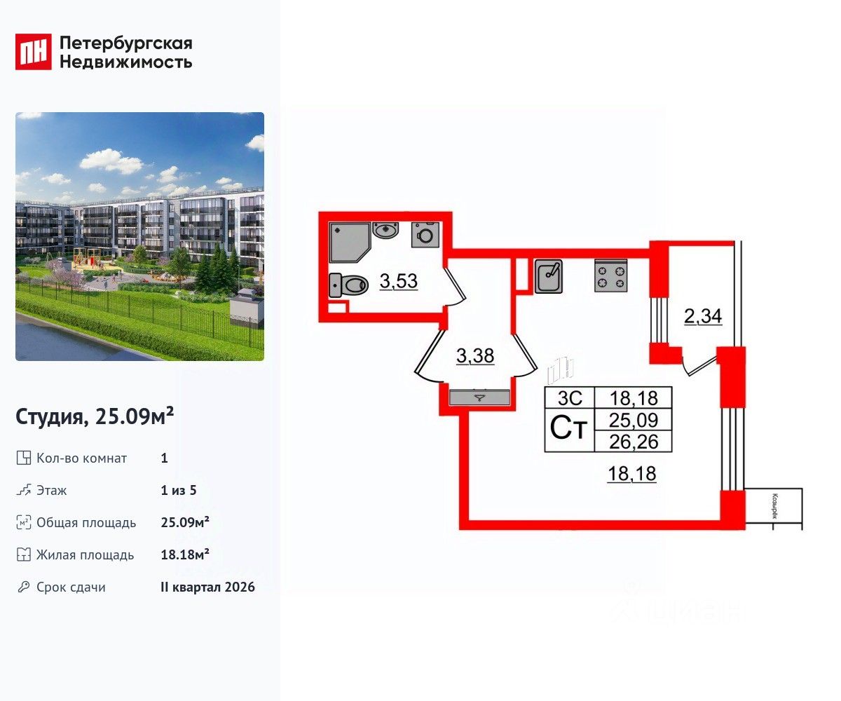 Удобная, классическая, функциональная европланировка, просторная прихожая 3.38 м². Общая площадь студии - 25.09 м², жилая 18.18 м², высота потолка 2.77 м.