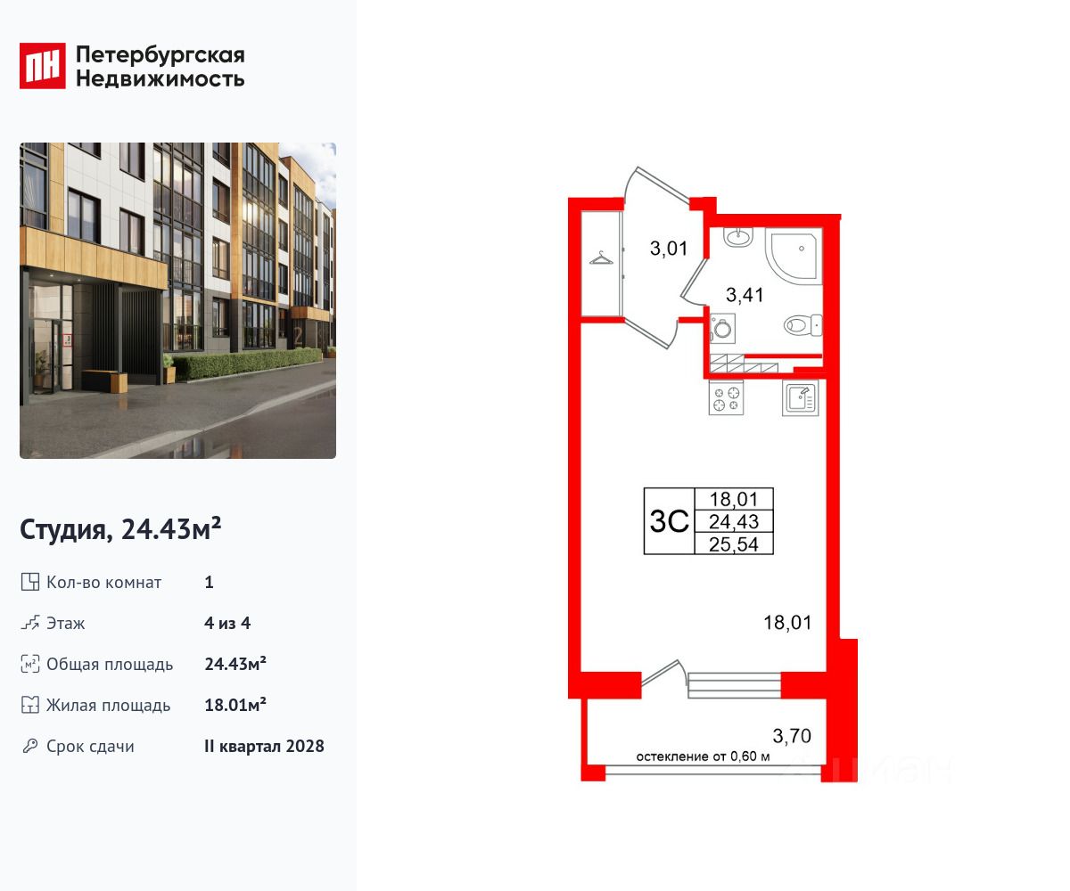 Удобная, классическая, функциональная европланировка, вместительная прихожая 3.01 м². Общая площадь студии - 24.43 м², жилая 18.01 м², высота потолка 3.07 м.