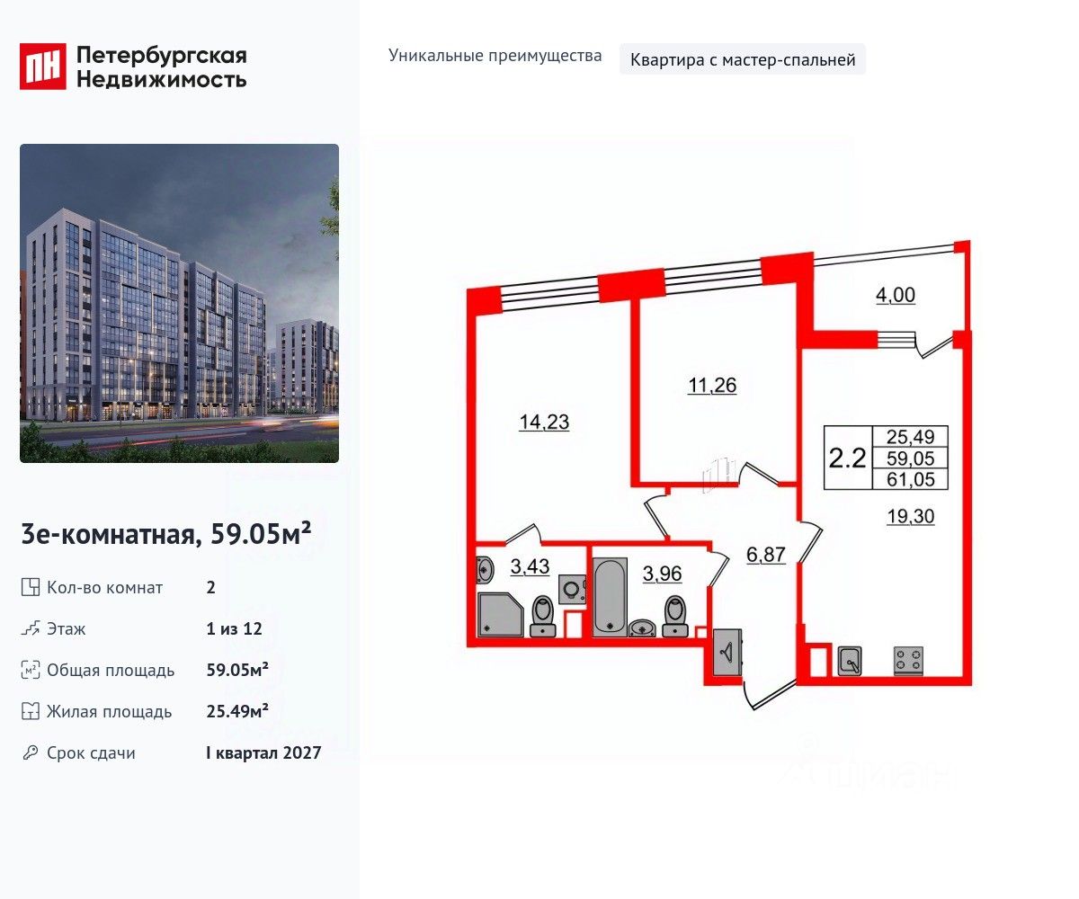 Уникальная, функциональная европланировка, большая кухня-гостиная 19.3 м², вместительная прихожая 6.87 м². Общая площадь квартиры - 59.05 м², жилая 25.49 м², высота потолка 2.77 м.
