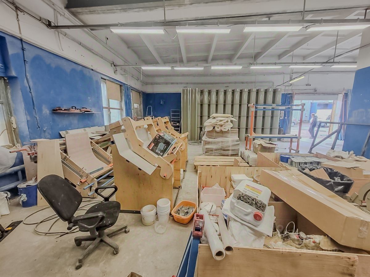 Характеристики помещения: Высота потолка 5.3 м. Окна в ноль всего помещения. Ворота. 2.9 х 2.9 м. (ШхВ). Ровный бетонный пол. Сан.узел