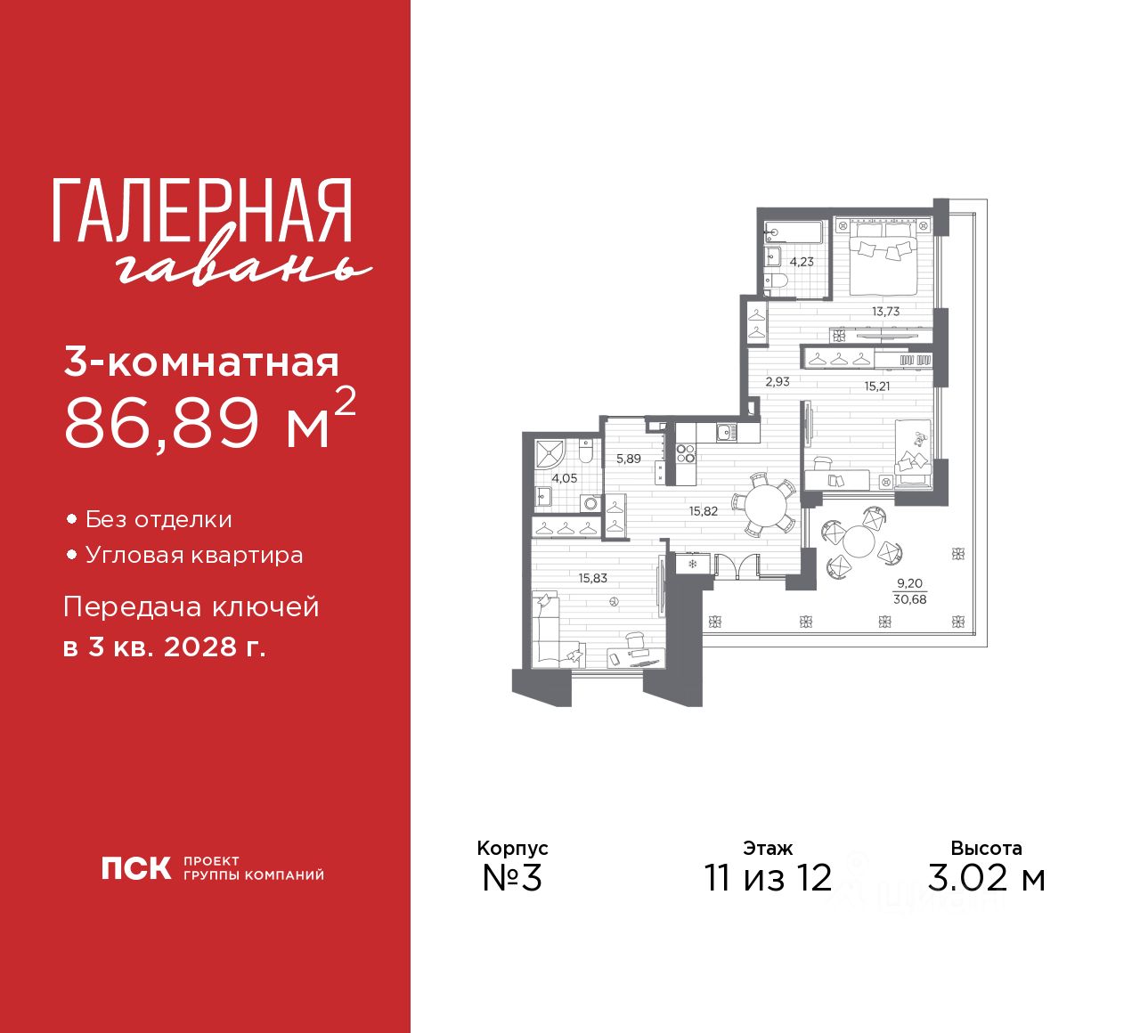 Трехкомнатная квартира в ЖК ''Галерная гавань'' на 11 этаже. Квартира без отделки, новый собственник может сделать ремонт по индивидуальному дизайн-проекту. Общая площадь: 86.89 кв.м., жилая: 44.77 кв.м., площадь просторной кухни-столовой: 15.82 кв.м. Квартира угловая, идеально подойдет любителям тишины и панорамных видов. В квартире один балкон, два совмещенных санузла. Наличие в квартире террасы размером 30.68 кв.м. открывает возможность для создания зон отдыха в кругу семьи и друзей. Высота потолков 3.02 м.