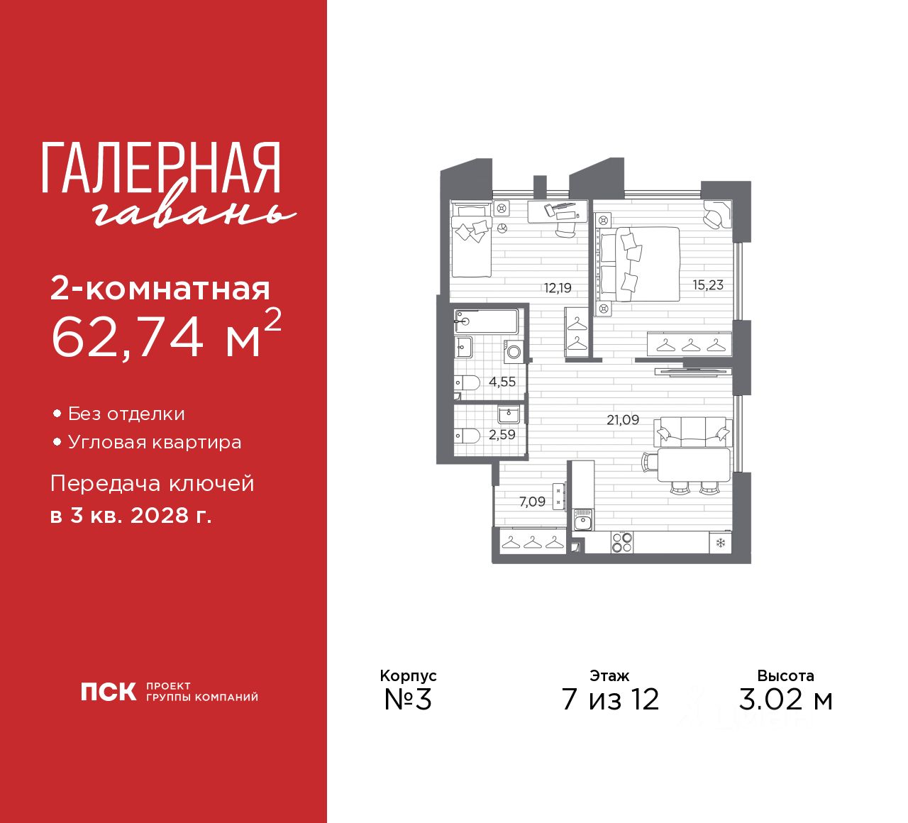 Продается 2-комн. квартира от застройщика в ЖК ''Галерная гавань'' на 7 этаже. Квартира без отделки, полностью готова к чистовой отделке и дальнейшему ремонту. Общая площадь: 62.74 кв.м., жилая: 27.42 кв.м., площадь просторной кухни-столовой: 21.09 кв.м. Квартира угловая, идеально подойдет любителям тишины и панорамных видов. В квартире один совмещенный и один раздельный санузел. Высота потолков 3.02 м.