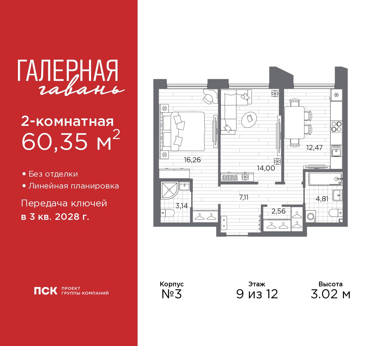 2-комн. квартира в ЖК ''Галерная гавань'' на 9 этаже. Квартира без отделки, после оформления собственности можно делать ремонт. Общая площадь: 60.35 кв.м., жилая: 30.26 кв.м., площадь просторной кухни-столовой: 12.47 кв.м. Комнаты изолированные, все окна выходят на одну сторону. В квартире два совмещенных санузла. Высота потолков 3.02 м.