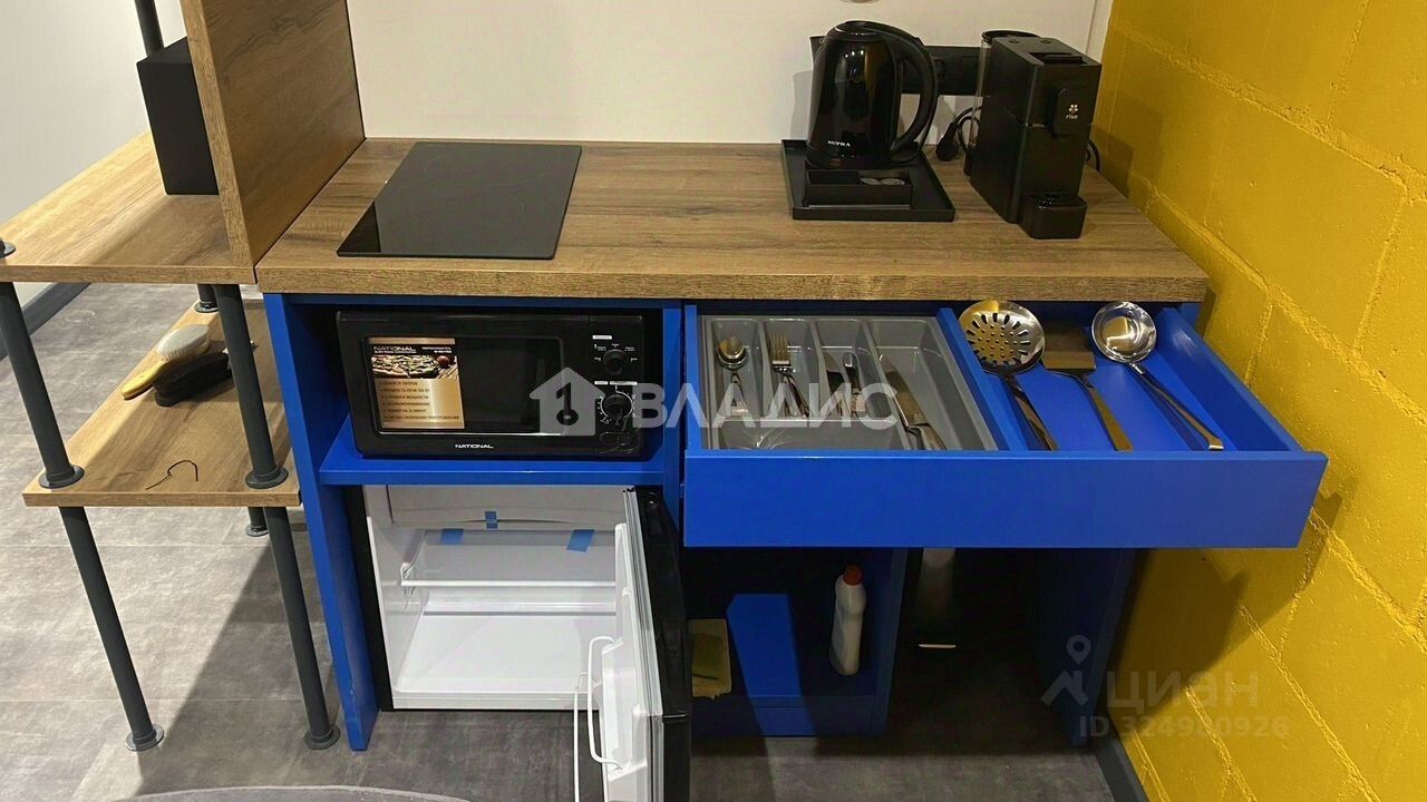 Студия имеет общую площадь 23 кв. м, жилую — 17 кв. м, площадь кухни — 6 кв. м. В квартире есть совмещённый санузел.