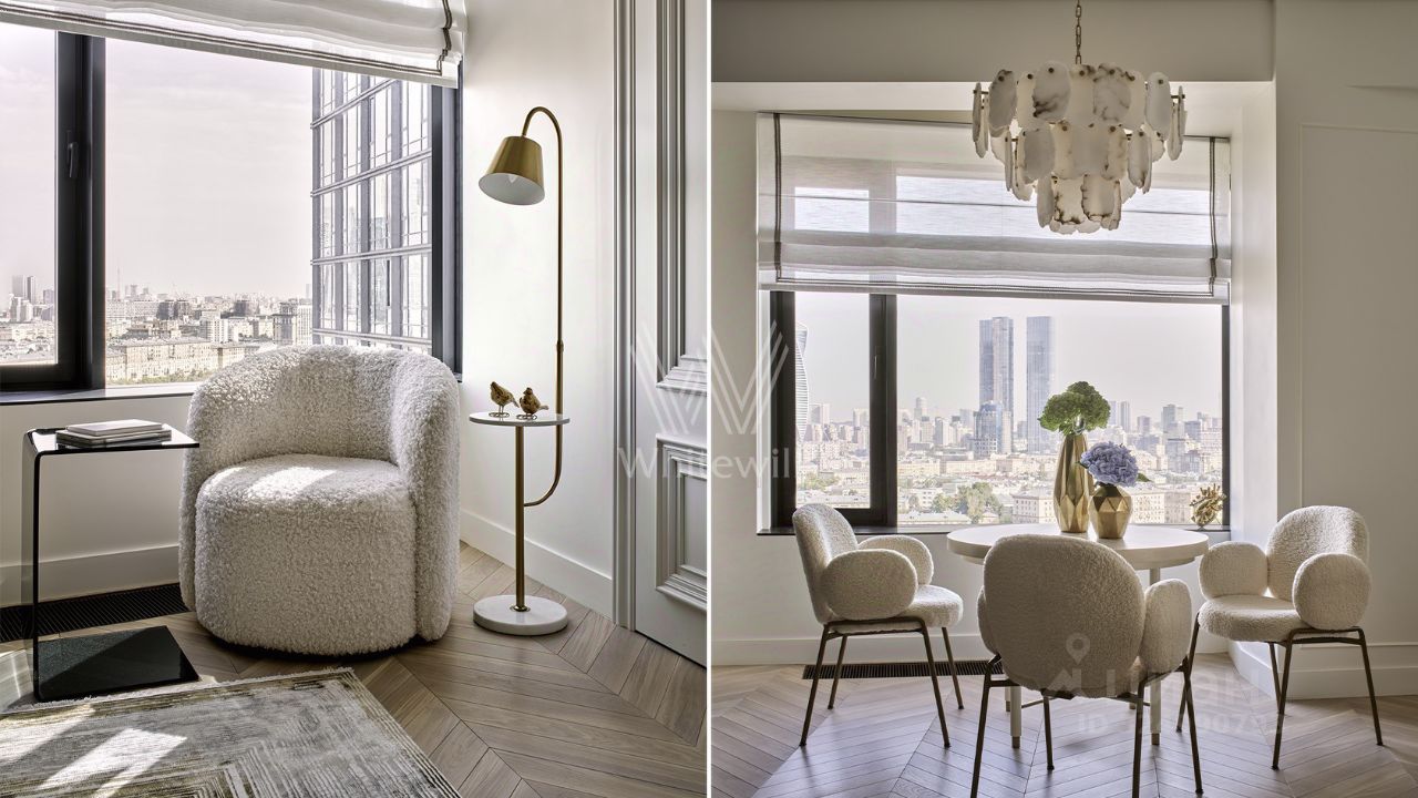Функциональная планировка включает просторную кухню-гостиную с обеденной зоной и лаунжем, мастер-спальню с собственной ванной, детскую спальню, гостевой санузел и холл со встроенными шкафами для одежды. Благодаря панорамному остеклению пространство наполнено светом и теплом, открываются виды на город и деловой центр ''Москва-Сити''.
