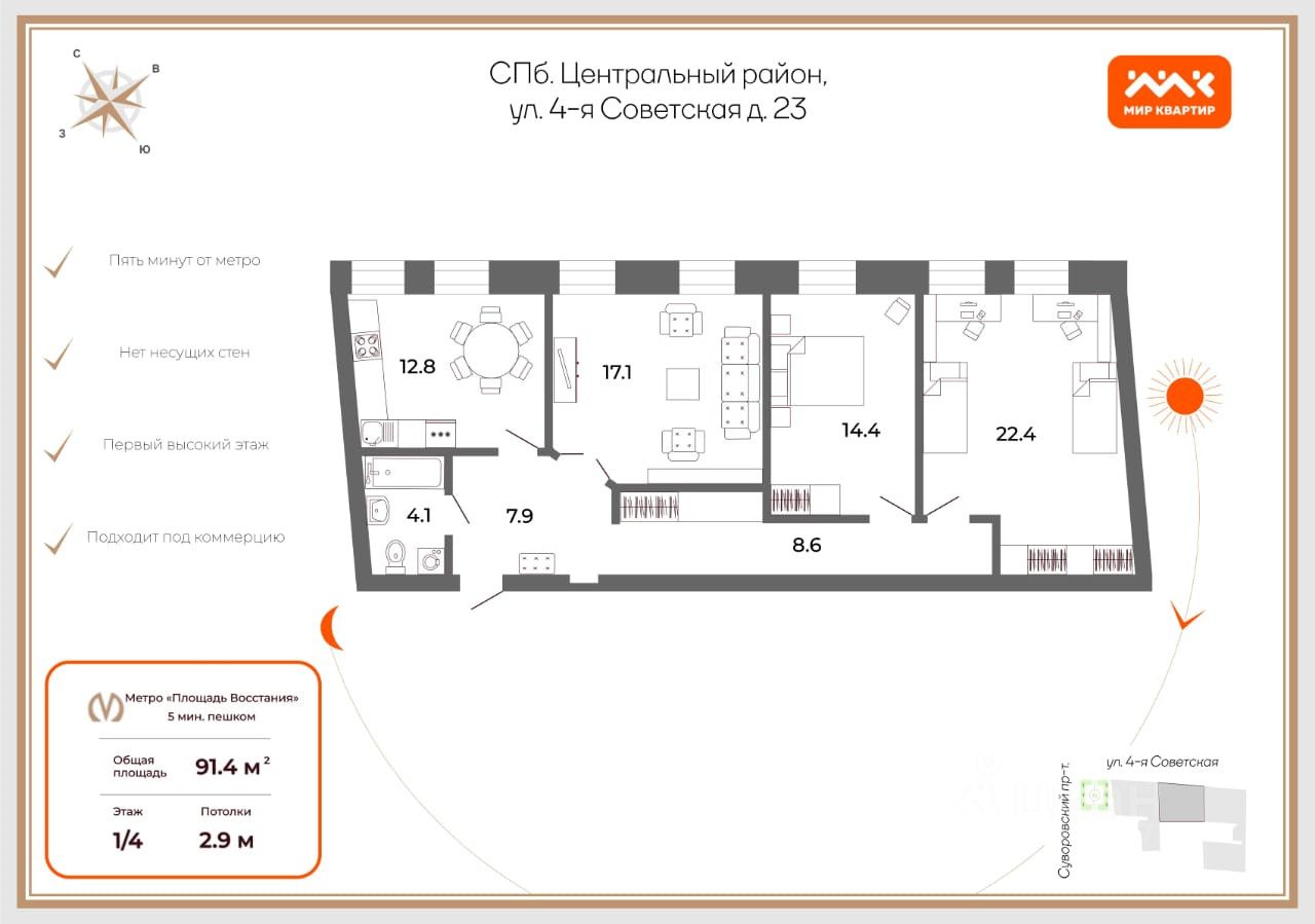 Локация: пять минут пешком до метро Восстания, микрорайон ''Пески'', оживленное, динамичное место, объект шикарно просматривается со стороны Суворовского проспекта, в минуте от дома остановка общественного транспорта, мимо квартиры проходит народная тропа.