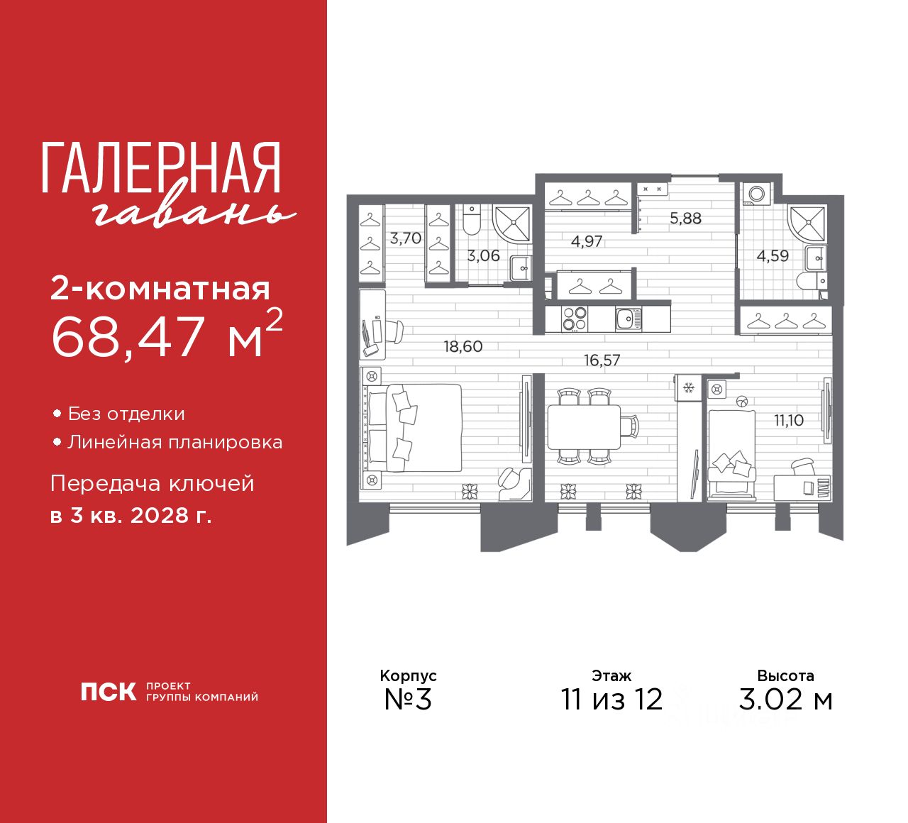 Продается 2-комн. квартира от застройщика в ЖК ''Галерная гавань'' на 11 этаже. Квартира без отделки, после получения ключей можно делать ремонт. Общая площадь: 68.47 кв.м., жилая: 29.7 кв.м., площадь просторной кухни-столовой: 16.57 кв.м. Комнаты изолированные, все окна выходят на одну сторону. В квартире два совмещенных санузла. Высота потолков 3.02 м.