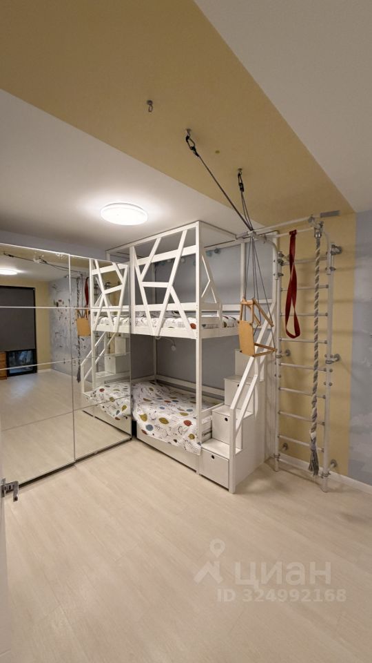 Большая детская — 20 м² идеально продумана для двух детей: — безопасная двухъярусная кровать — большой письменный стол — спортивный уголок — шкаф для книг — просторный встроенный шкаф для одежды — зоны хранения в кровати