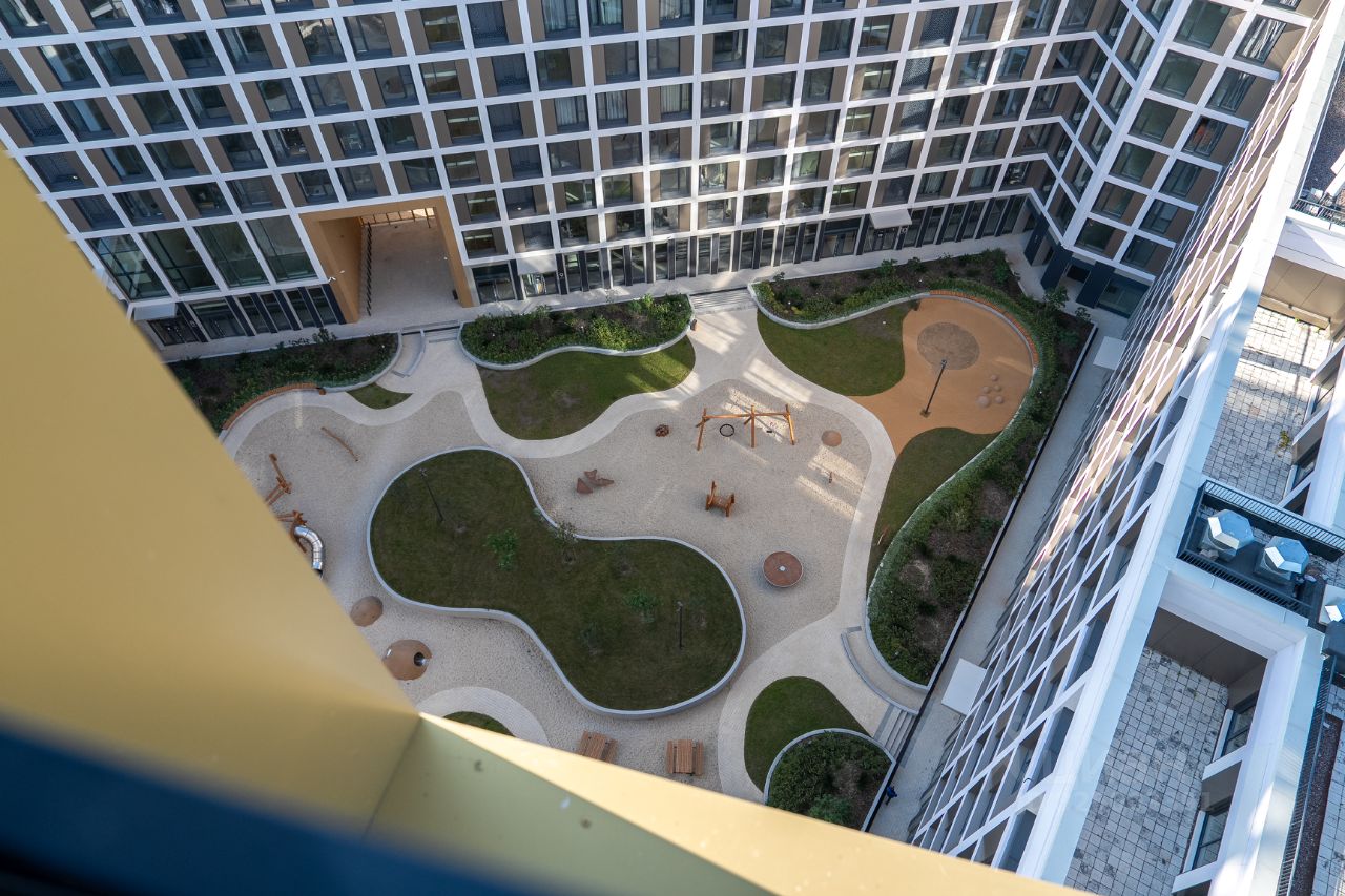Архитектура от KCAP & Orange Центральное лобби с камином, баром и библиотекой Клуб резидентов: коворкинг, переговорные, детская игровая Фитнес-клуб Sport Life Ресторанная улица, кафе, гастробары Подземный паркинг с зарядками для электромобилей Кладовые помещения Благоустроенная на