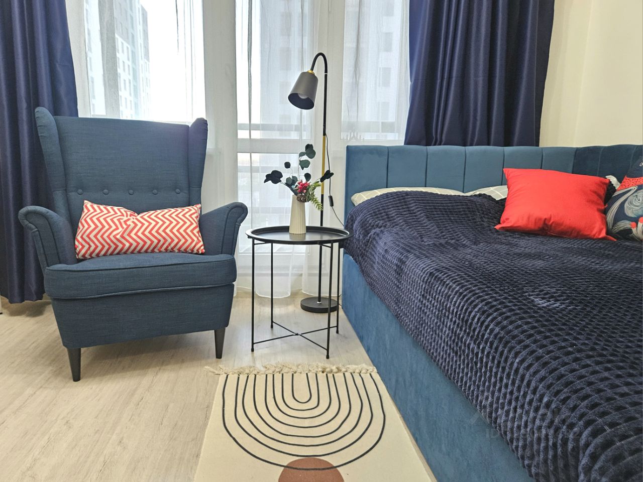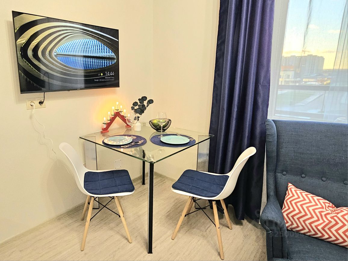 Все наполнение новое: - 1,5 спальная кровать шириной 120 х 200 с ортопедическим матрасом, - стол, - 2 стула, - Smart телевизор 43 дюйма, - кухонный гарнитур - индукционная варочная поверхность, - вытяжка, - холодильник, - микроволновая печь, - вместильные шкафы, - система хранения в прихожей, - стиральная машина, - посуда: кастрюля, сковорода, чашки, тарелки, столовые приборы, ножи, стаканы, - новое постельное белье. - современная душевая система. Имеется уютная лоджия.