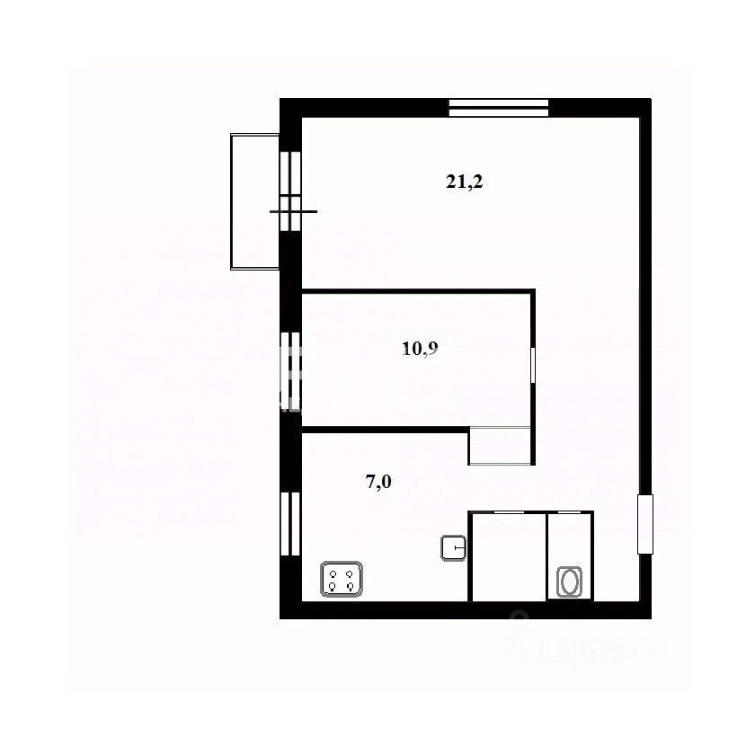 *Общая площадь 51,4 кв.м, комнаты 21+10,9 кв.м, кухня 7 кв.м (есть посудомоечная машина).