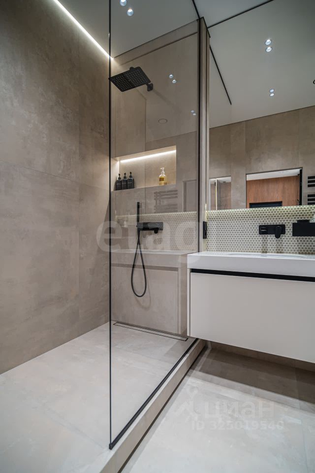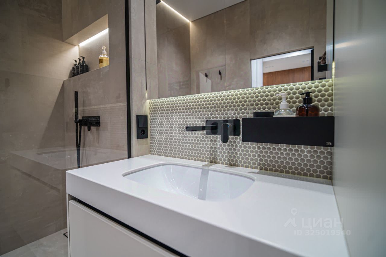 Отдельного внимания заслуживает роскошная гардеробная — просторная, с подсветкой, качественными системами хранения и стеклянной дверью. Она создаёт ощущение уровня, присущего премиальным интерьерам. Санузел выполнен с применением крупноформатного керамогранита Atlas Concorde и оснащён стильной современной сантехникой. Инженерная начинка квартиры также на высшем уровне: аккуратно собранный узел учёта, фильтры, запорная арматура — всё выполнено грамотно и надёжно, с расчётом на долгие годы эксплуатации.