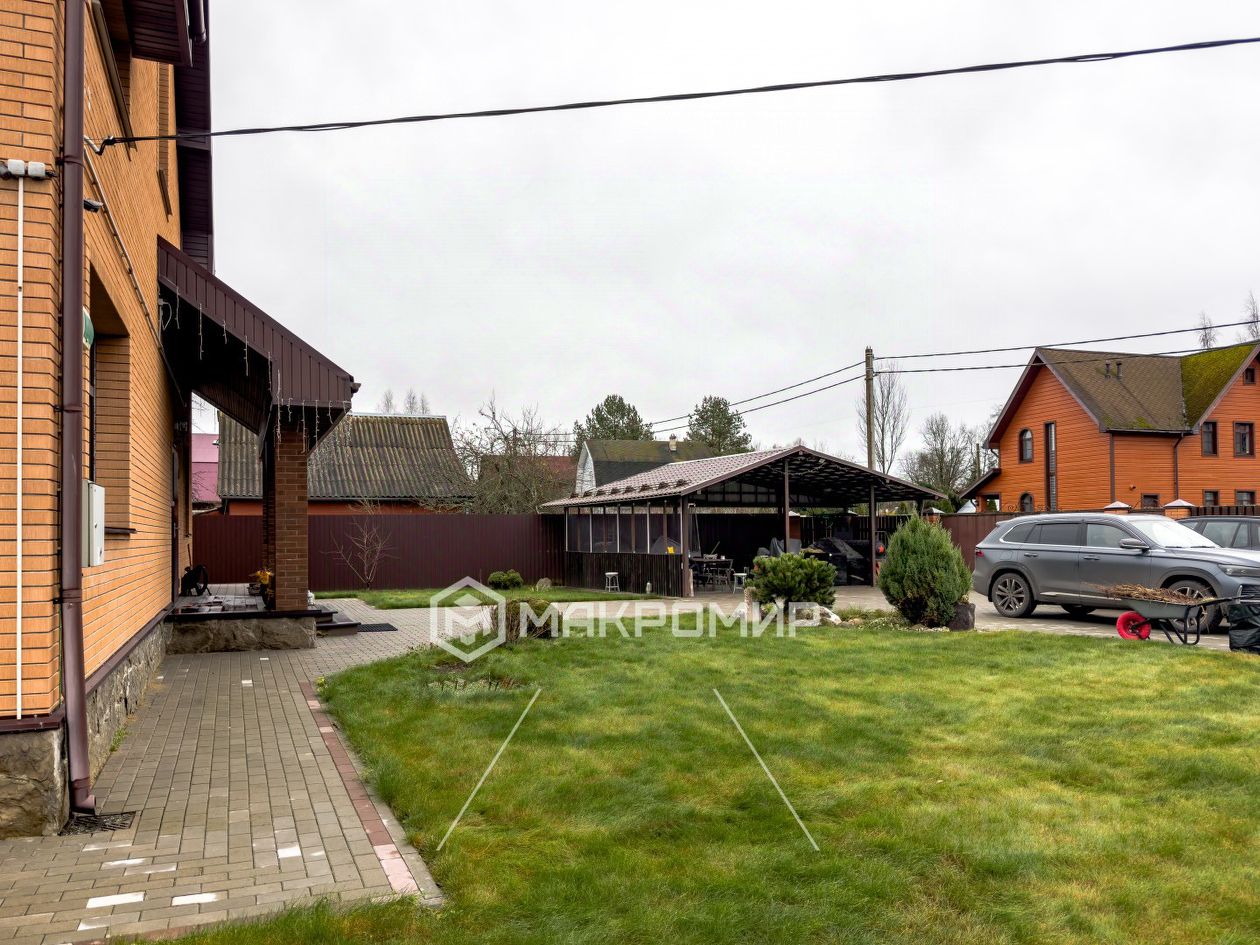 Большой сухой участок правильной прямоугольной формы. По периметру участка - дренажная система для отвода дождевых и талых вод. На участке расположены деревья, кустарники, туи, есть возможность для посадки новых деревьев. Участок покрыт ухоженным газоном. Пешеходные зоны и парковочное пространство вымощены каменной плиткой. На участке помимо основного дома расположены: гостевой дом размерами 14х7 м, русская баня 6х6 м, отдельный погреб вне дома, просторная парковочная площадка для нескольких автомобилей, включая навес для двух автомобилей, спортивная площадка теплица, мангал.