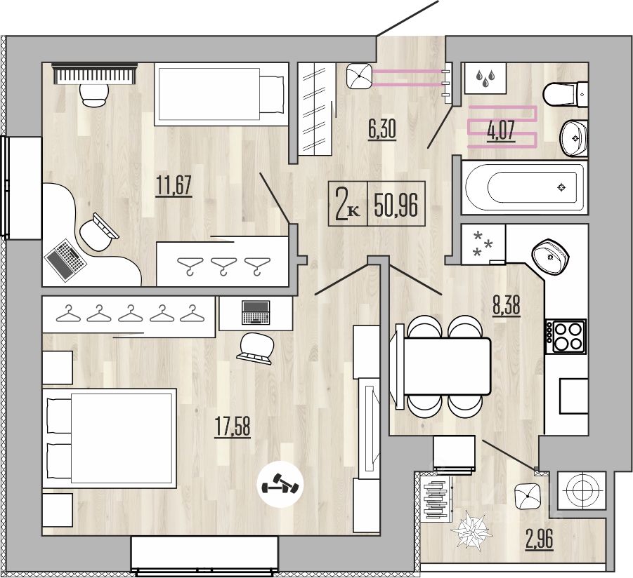 Классическая двухкомнатная квартира площадью 50,96 кв.м. Высокие потолки 2.7 метра! Отдельная кухня с удобной рабочей зоной. Большая мастер-спальня и детская комната.